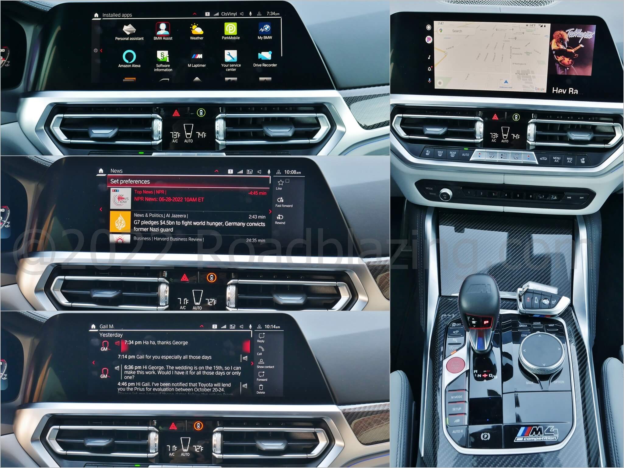 2022 BMW M4 Competition xDrive: BMW I-Drive 7 voice interacting native apps include Navigation, SMS messaging, and dual theme Caring Car cabin ambience