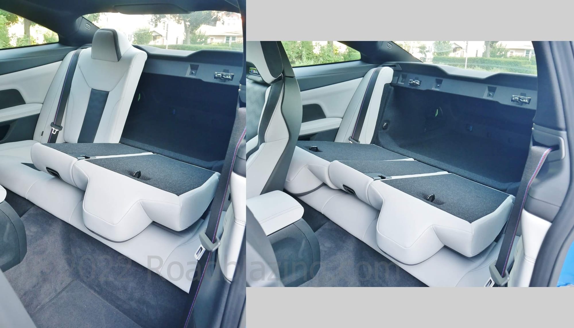 -1: Commensurate rear occupant head shaving with sloping roof. 2nd Row knees brush front bucket seats deep hard backs. Lacks seat belt shoulder assist from B-pillar.