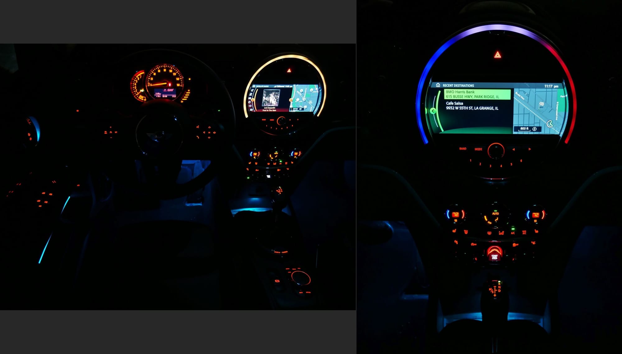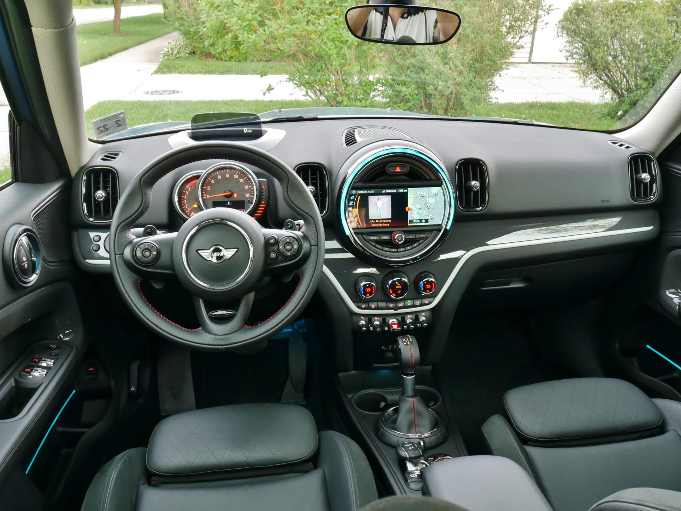 Details Done Right: √ Gated toggle switches, including glowing red illuminated keyless ignition; √ Variable color full cabin ambient lighting; √ Tilt / telescope JCW steering wheel = perforated leather rim inserts, w/ dorsal finger indentations;