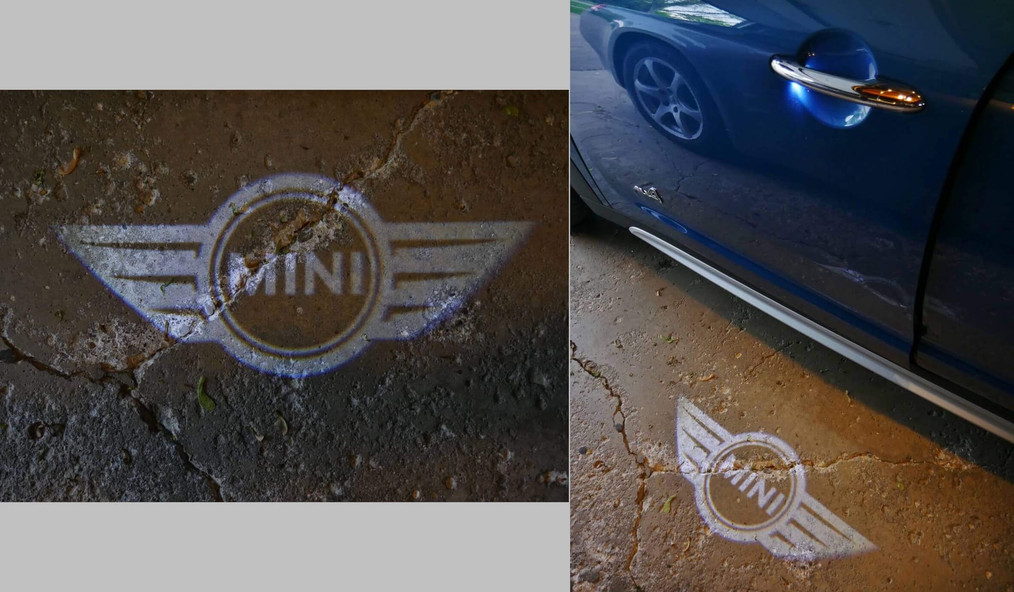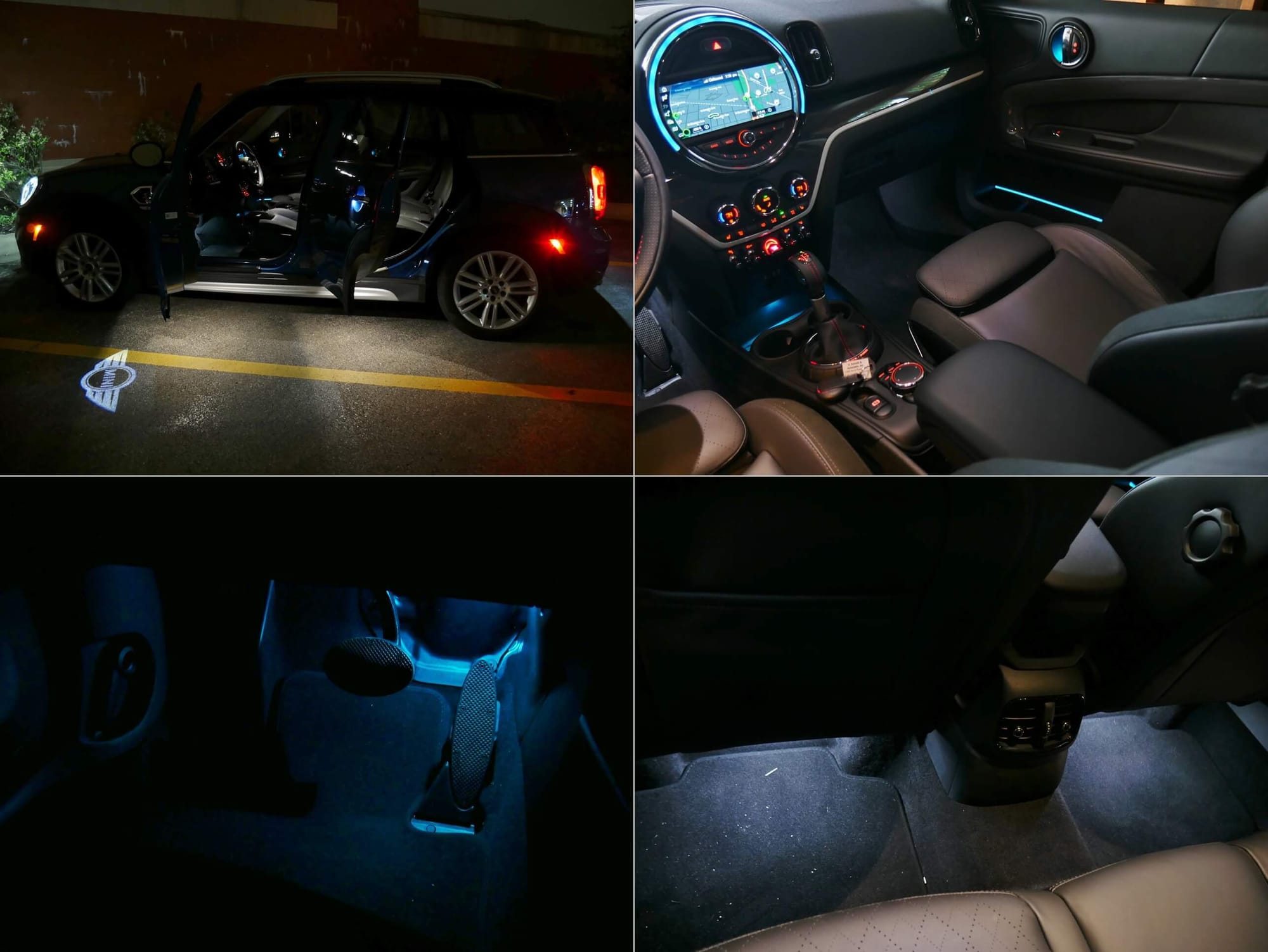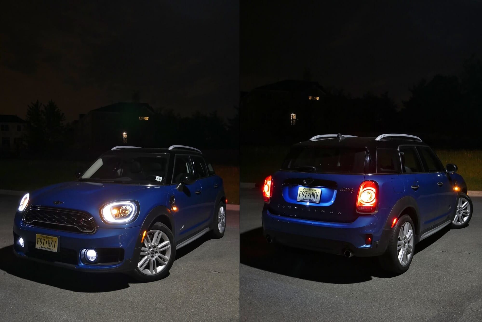 2017 MINI Cooper Countryman S All4: Island Blue Metallic at night w/ attention grabbing "Angel Eye" front headlamp LED DRLs, winged puddle lamps
