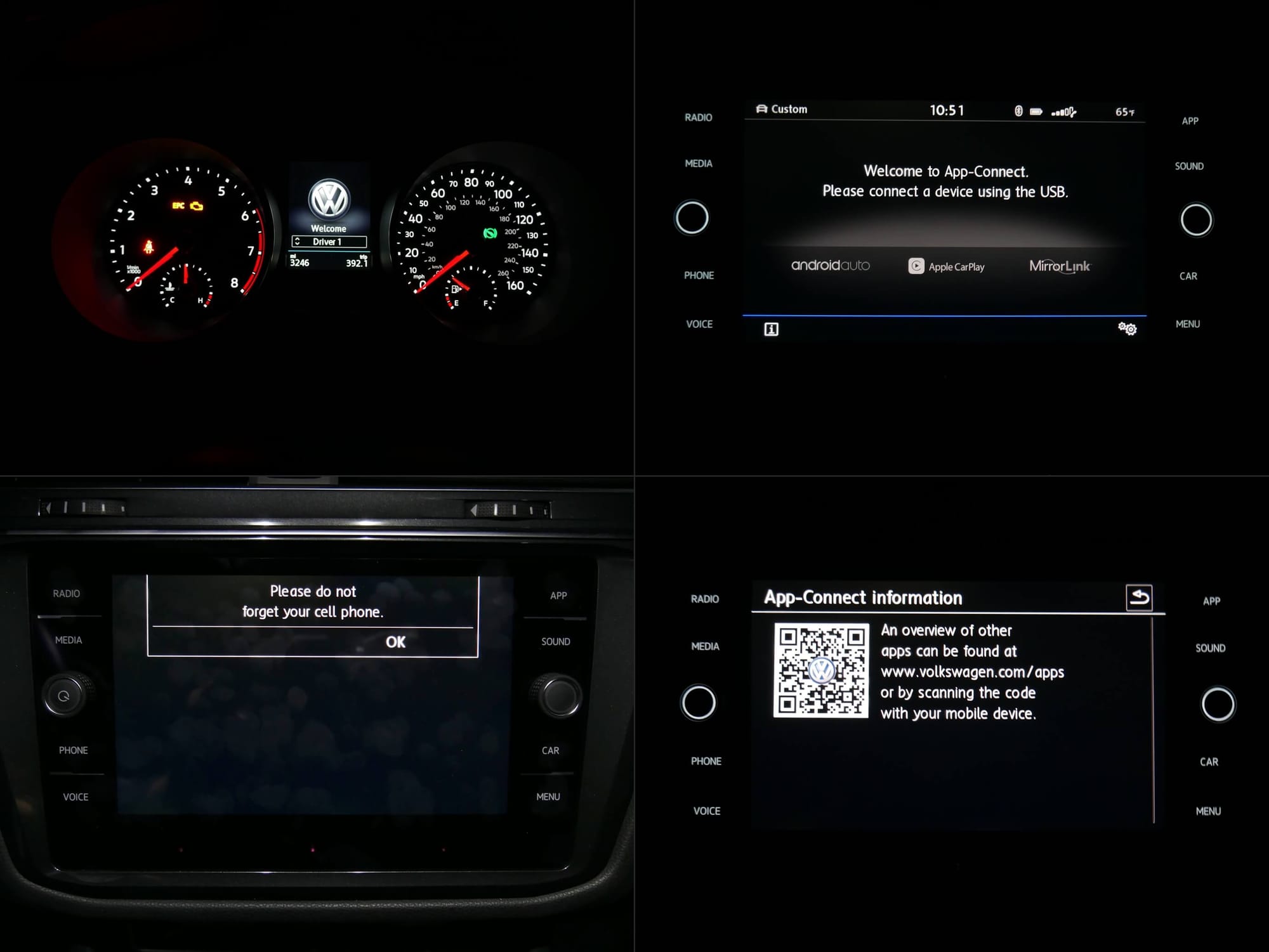 HOW "APP" -LICABLE: √ tablet style 8" flat-panel capacitive touch LCD infotainment screen w/ gesture icon control; √ Voice command hands-free communications; √ Android Auto, Apple Car Play & MirrorLink smart phone apps; √ Subscription based VW Car-Net telematics; √; 160 W, 6- speaker audio loud but shrill; √ USB x 3, 12V x 3