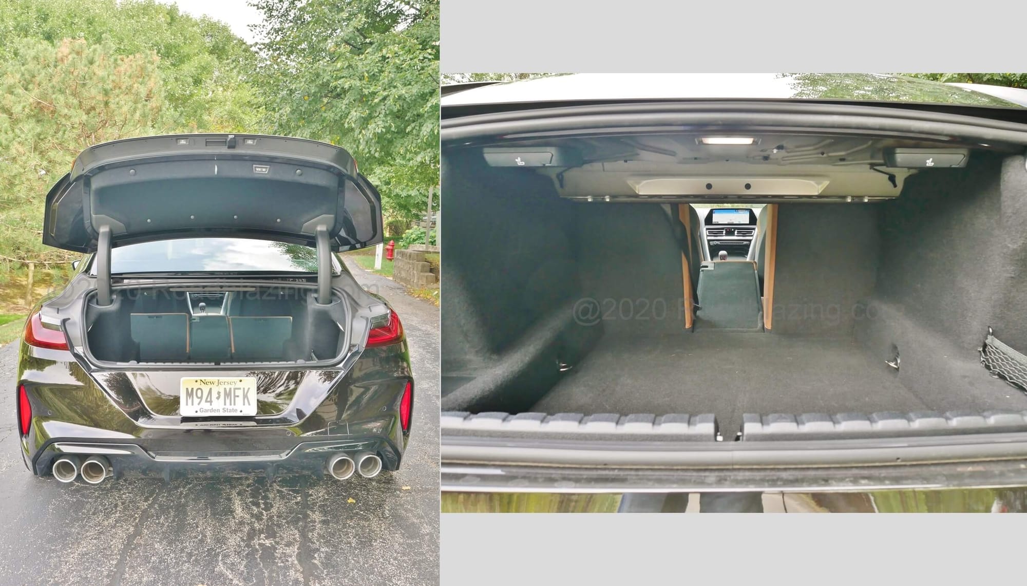 2020 BMW M8 Gran Coupe: trunk registers good enough for short trip 11 cubic feet, , 40/20/40% split 2nd Row seatback for trunk pass through