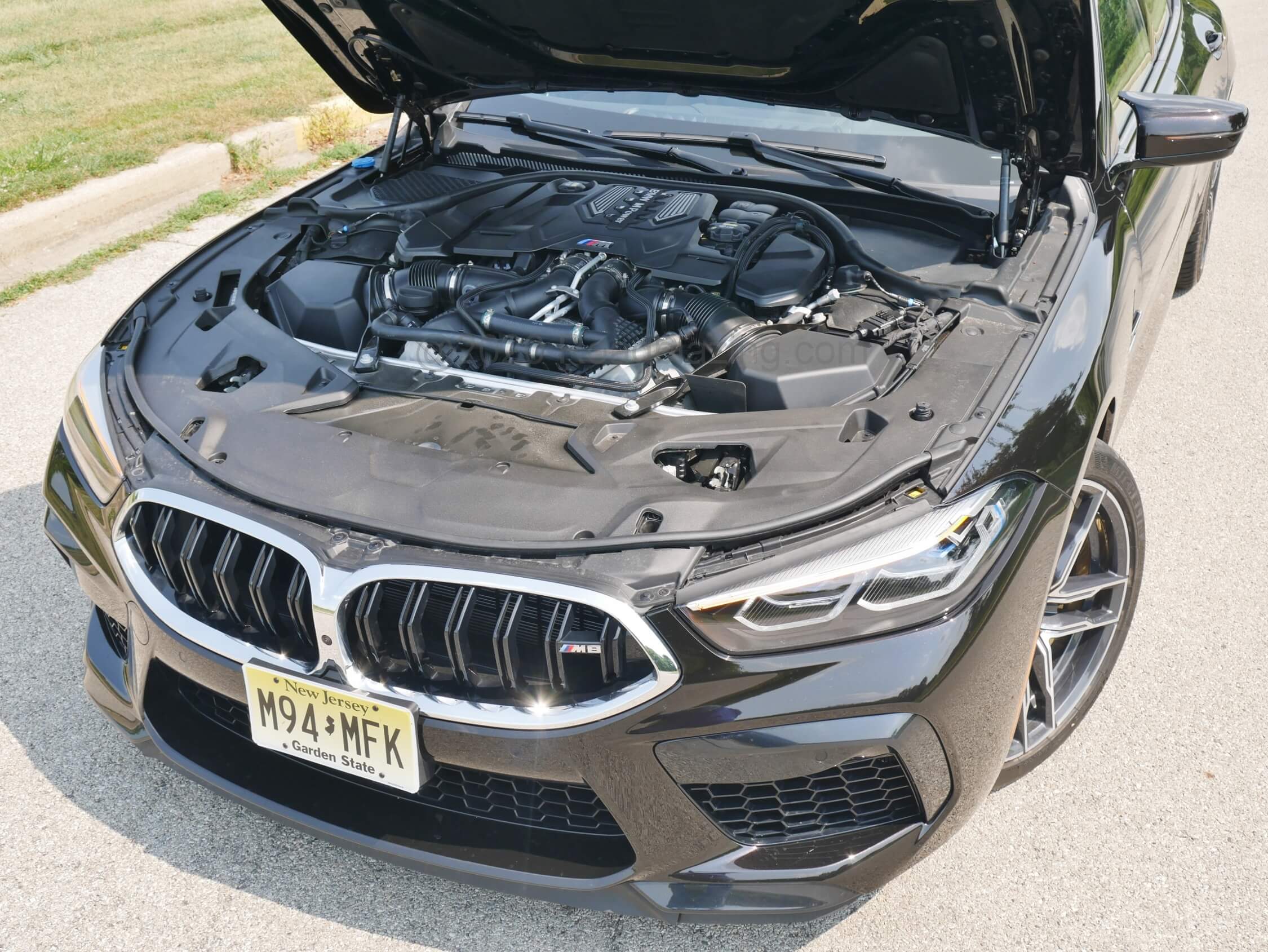 2020 BMW M8 Gran Coupe: V-8 twin electric intake chillers feed Hot V twin turbos with 25.9 PSI boost; Active dual exhaust