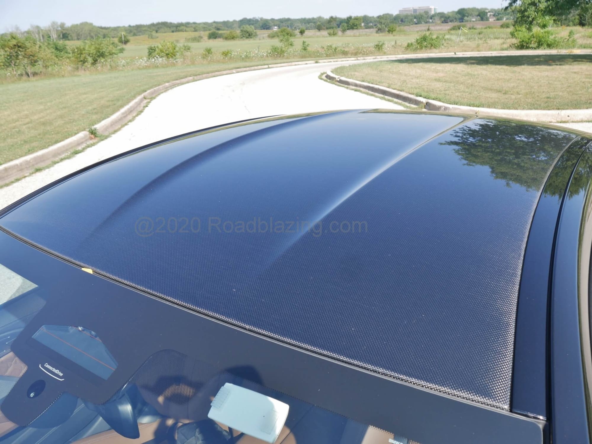 • ON THE SIDES: An aft fender heat extractor carries a trapezoidal "M 8" emblem. From there a concave valley follows along the Coke-bottle fuselage. Sail panel power folding wing mirrors have an illusion of racy thin dual arms. Integrated side skirting flares match the body. Frameless door windows evoke a lightness. A subtle rear hip imparts is topped off by a considerable D-pillar kink. The sharply raked front glass meets a carbon fiber roof with center valley, descending with a coupe's silhouette.