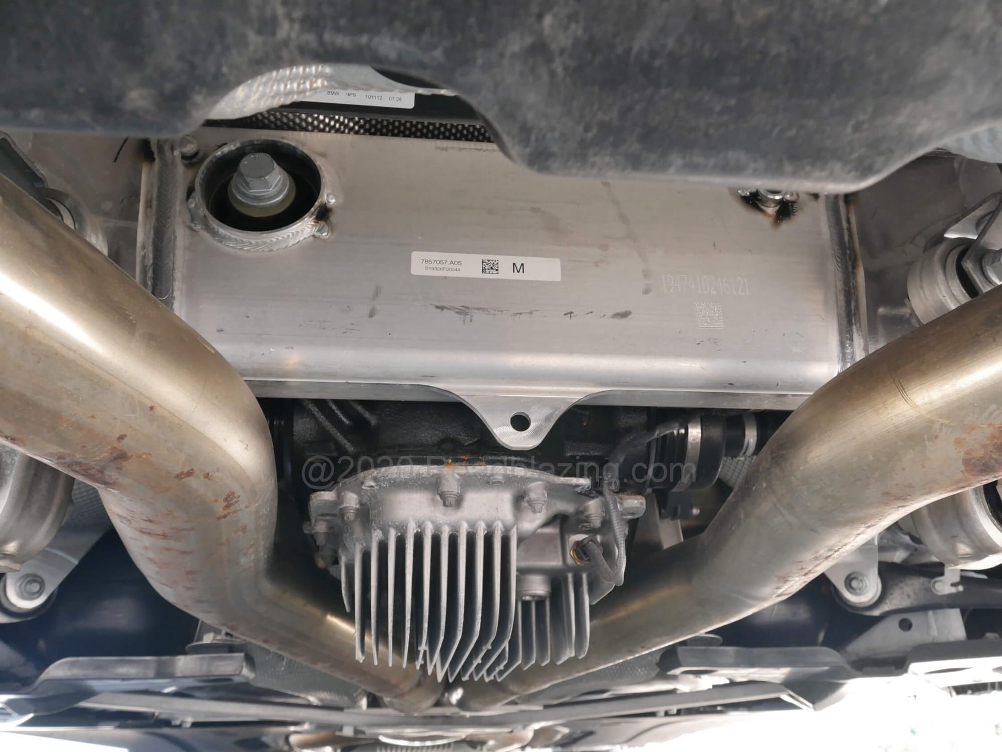 HOW ROADWORTHY: Rumored to be the last pure gasoline powered BMW M-Series V-8 before a move to something with battery electric assistance, the potency is of this latest tune of S63B is undisputable. A gander at the huge electric intake chillers under hood hints at aggressive intake fuel rate, air flow, cooling and oiling measures. That and electric wastegates endow the twin Honeywell turbos with 25 psi of vicious boost.