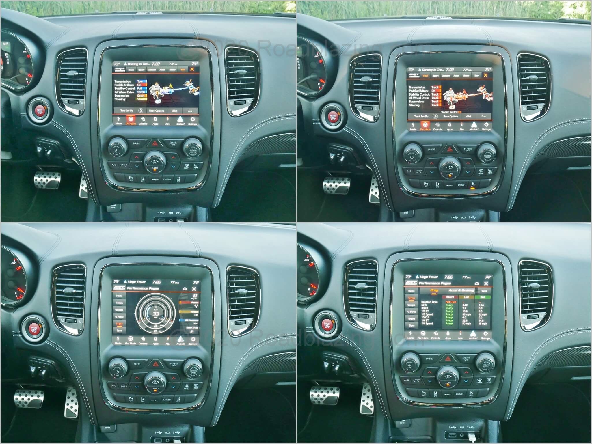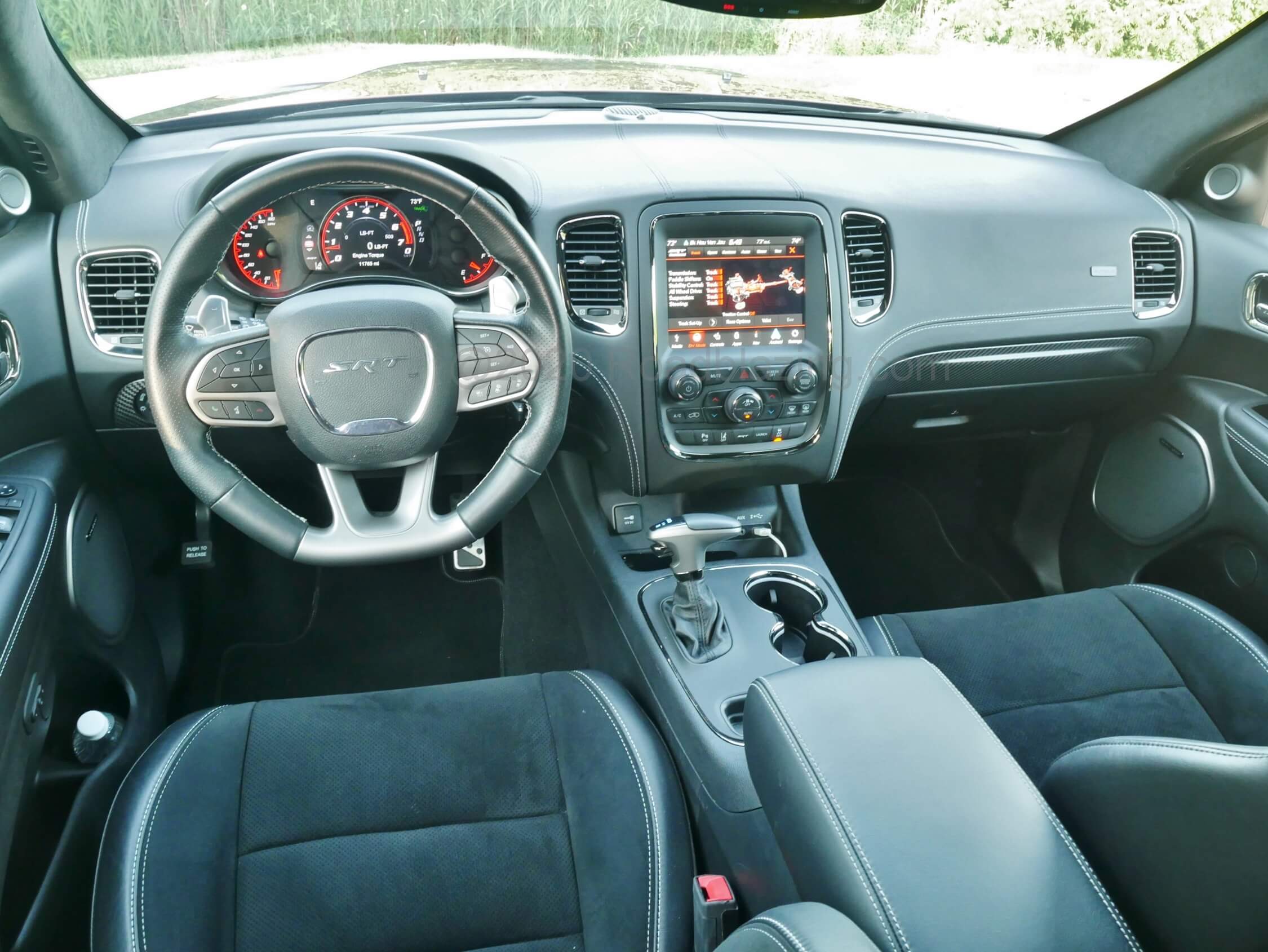 2020 Dodge Durango SRT 392: comrpehensive triple dial TFT instrumentation, beefy D steering wheel, 8.4" LCD touch UConnect infotainment screen, 2nd Row climate & connectivity