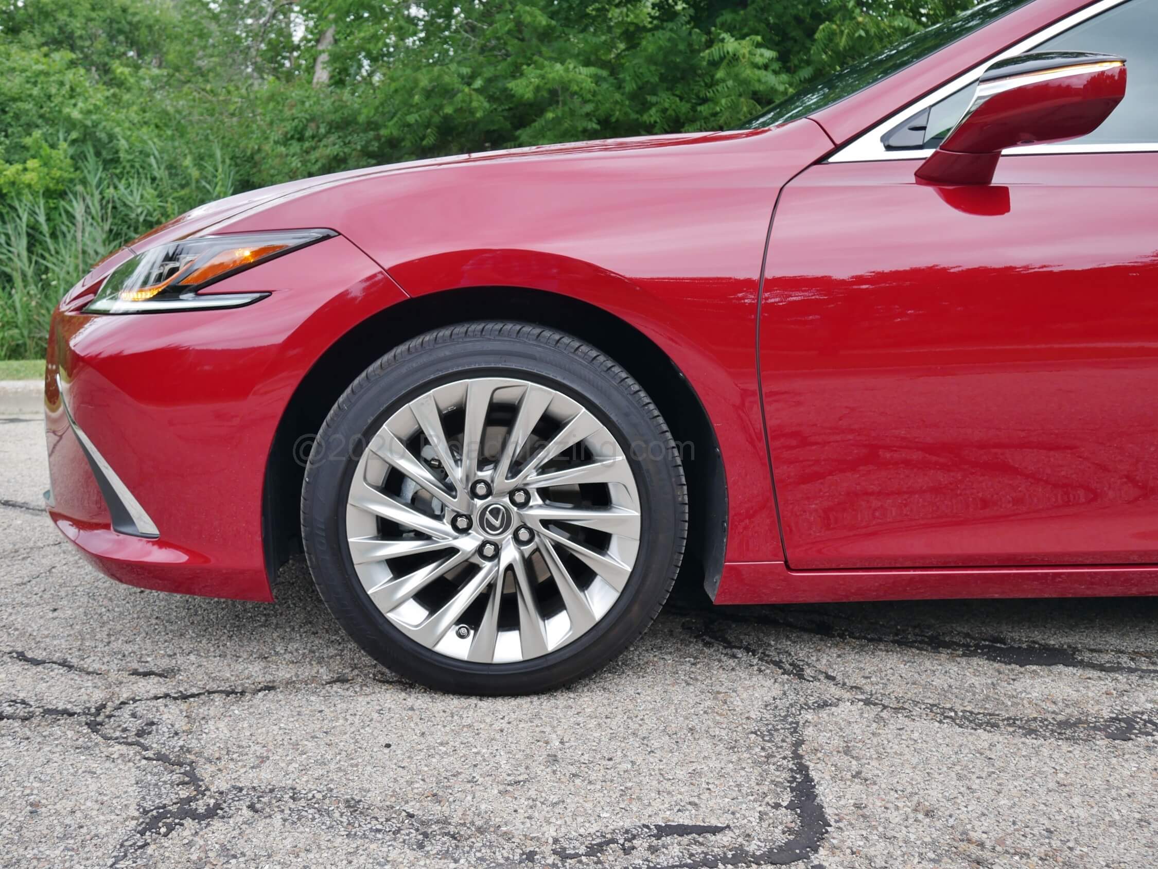 - SPINDLE GRILLE DETRACTORS BEWARE: There is little other than badging and unique fan blade wheels to differentiate from the non-hybrid ES 350. The current state of Lexus sedan design language of coke bottle fuselage with coupe-like flared fenders and rear quarters is accented by L shaped boomerang front DRLs, rear directionals and spindles on the pronounced wide spindle grille. Door mounted wing mirrors suggest a low slung attitude. Once the brazen grille is digested all the others swaths of chrome are appropriate for a luxury conveyance.