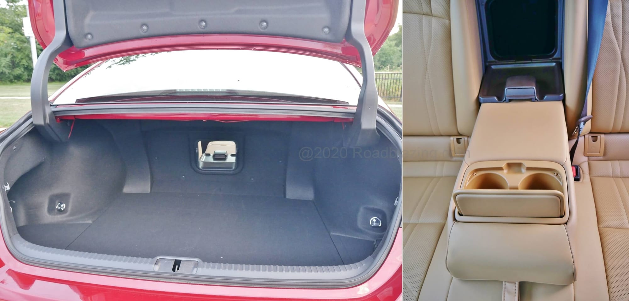 HOW USEFUL: √ Trunk space = no longer suffers from partial battery accommodation; √ Trunk pass through; √ Cargo tie-down net; √ Center-stack matching wood hinged lid phone slot w/ optional Qi wireless charging = 2 devices; √ Wide front center armrest, dual driver and passenger side lid release, shallow felt bottom bin; +1 Proximity power release and close trunk lid; +1 Spacious door pockets; +1 Cupholders x 4, Bottle holders x 4 (each door); Split shelf, felt lined glove box; -1 Shallow trunk aperture; -1 No overhead sunglasses bin.