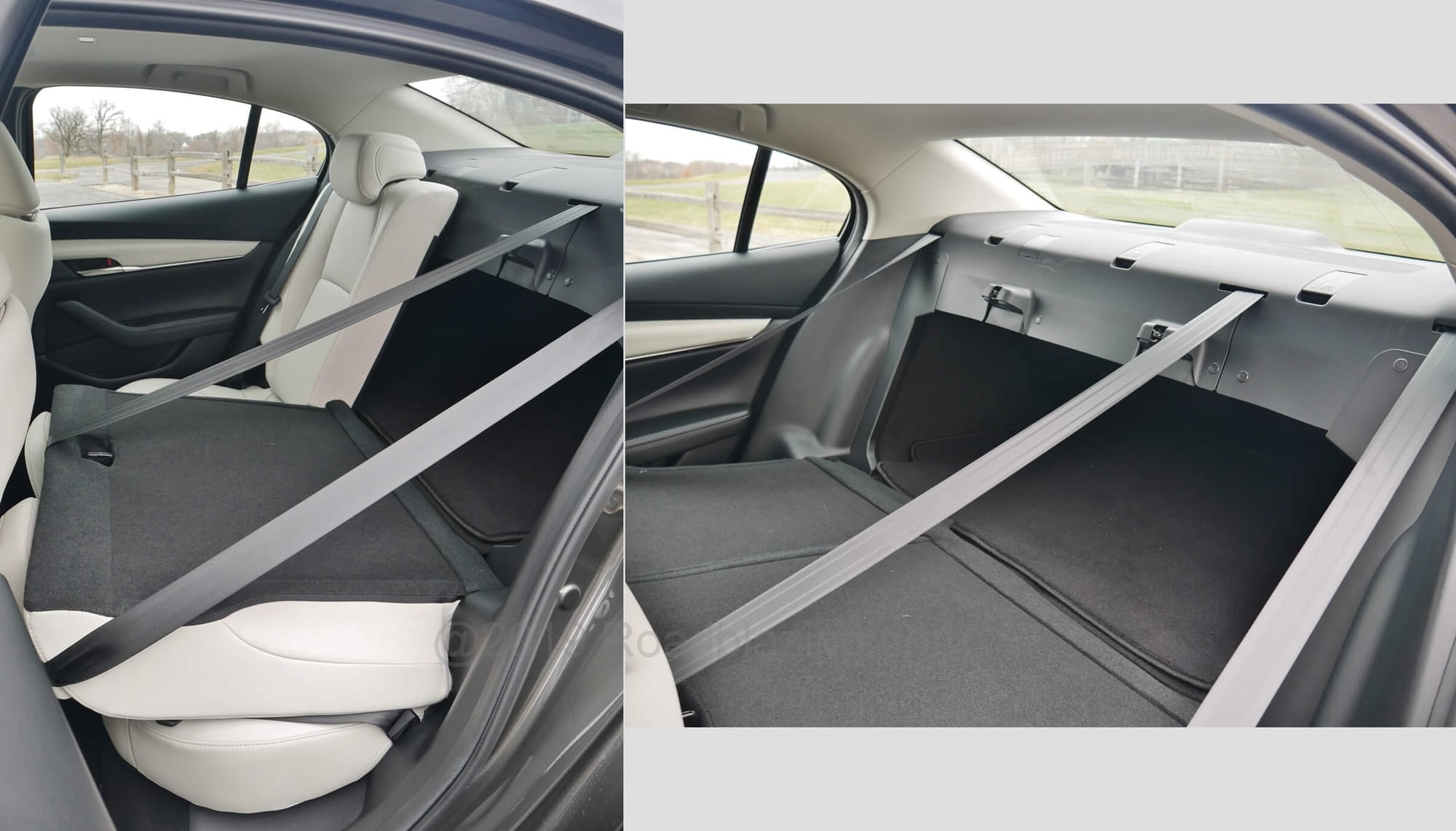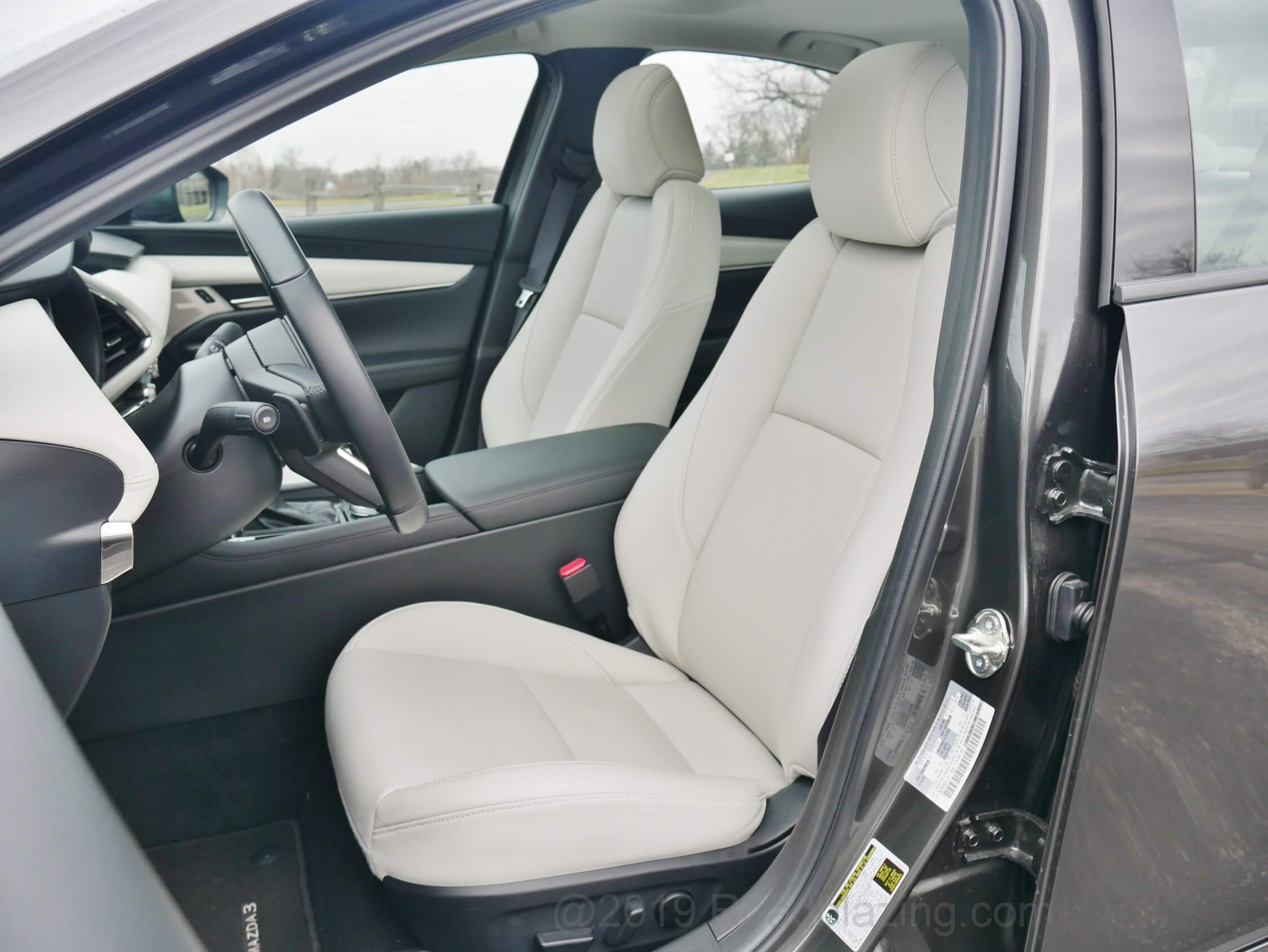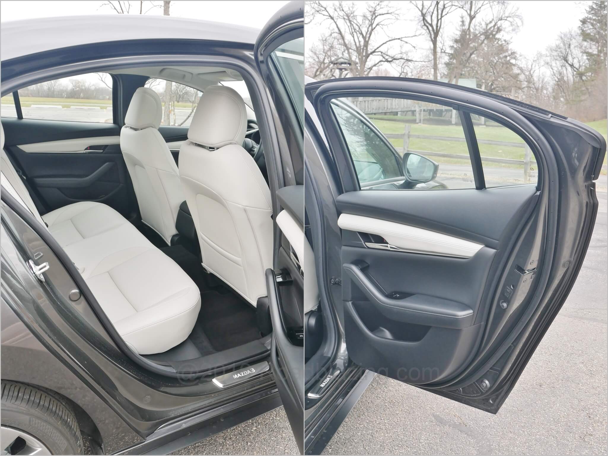 2020 Mazda 3 Sedan AWD Premium: light gray leather seating, heated in front, with seriously padding and improved head room, but knee stinginess in 2nd Row