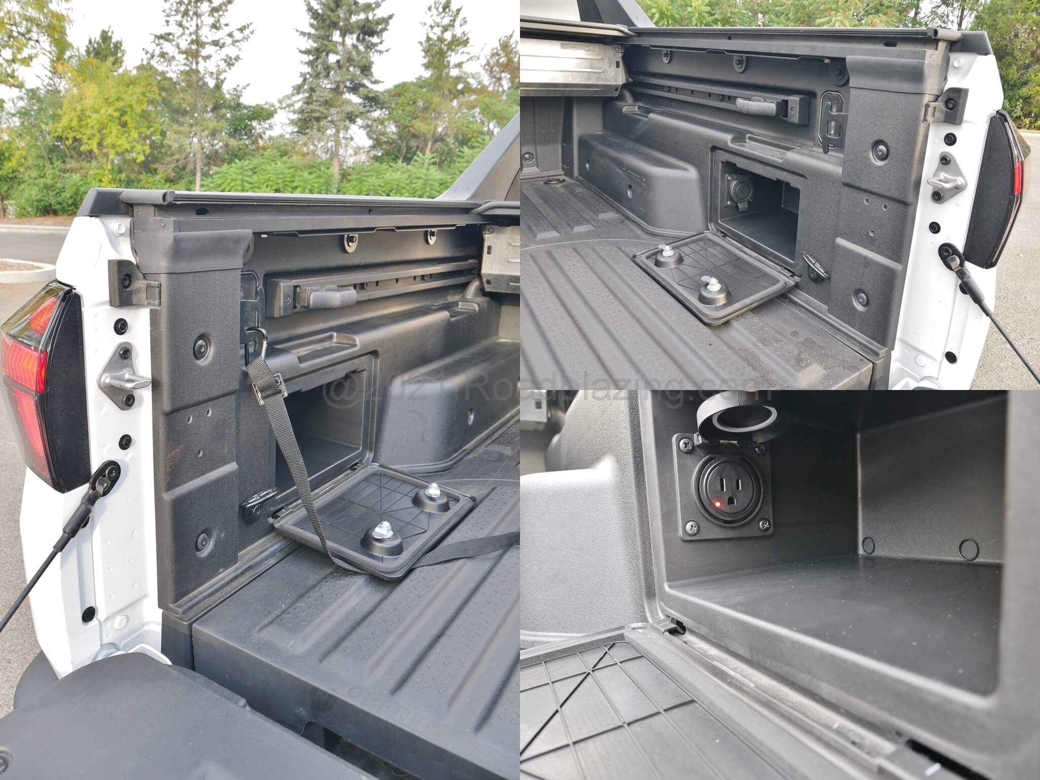 Outside: √ Composite lined 4.0' foot cargo box; √ Corner & center bumper steps; √ Sliding J cleats x 2, fixed T cleats x 2, lower hook anchors x 4; √ Dual cargo box side storage bins, R side w/ 115 V AC power outlet; √ Power release, easy action tailgate hinges; √ Integrated rolling box tonneau cover; √ Cargo box sub-bed storage bin w/ hinged cover and drains; √ White LED overhead box lighting; √ Sliding rear cab center backlight.