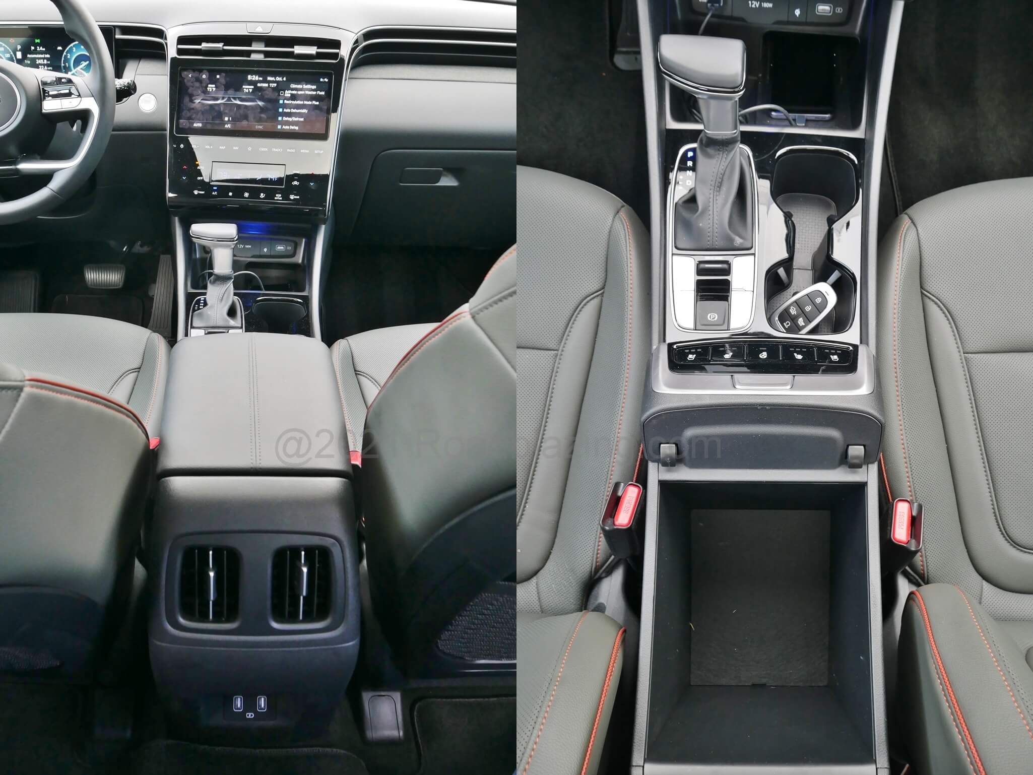 HOW FRIENDLY: 2022 Hyundai Santa Cruz, in top Limited trim, unveils occupant space which handily rivals entry luxury cars in execution. Operations are anchored by two monolithic tablet style displays, much as is found in current PEVs, and a nearly flat surfaced center console featuring a three push-button transmission selector. The result is dramatically de-cluttering and seamless surface continuity. An elegant tandem lateral metallic banding spans the upper dash cowl, including vent-work then extending into door panels, where the upper layer is filled with orange accented ballistic fabric.