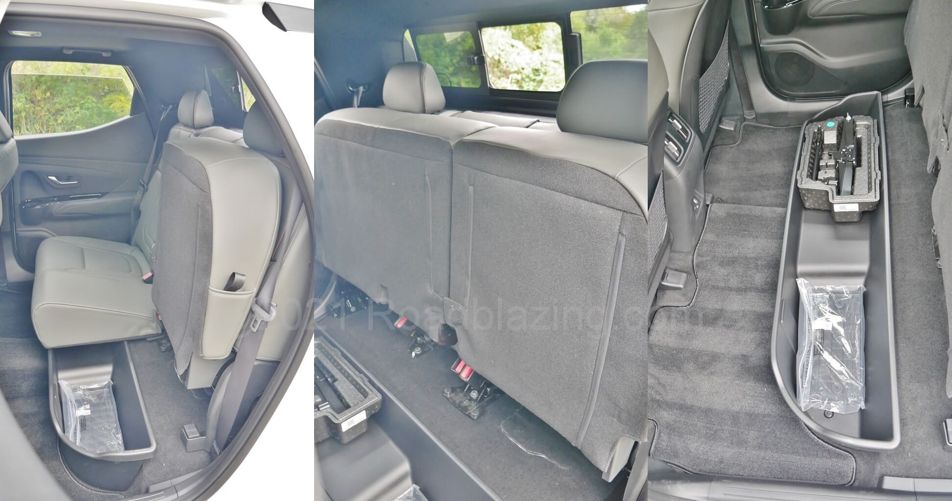 Inside: √ 60:40 split 2nd Row fold-up bench cushions; √ 2nd Row sub-bench storage bins; √ Cup holders x 4, door bottle holders x 4.