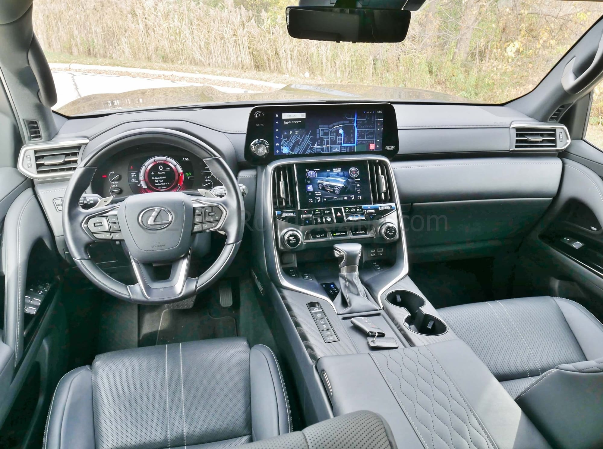 HOW ROADWORTHY: For the first time the Lexus LX flagship SUV shares powertrain and drivetrain with the Lexus [LS 500] flagship sedan. The new twin-turbo V-6 emits a prestige transforming to an OHV V-8 growl when pinned. The new 10-speed Aisin transmission, (derived from the LC 500 flagship sport GT coupe), locks sooner & more quickly owing to a multi-plate torque converter, reducing engine flare, for more refined forward movement.