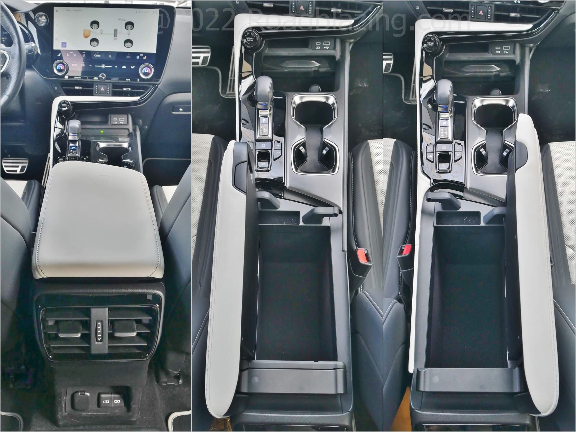 - +1 Deep center armrest bin w/ power, connectivity + reciprocal lateral fold lid; 2nd Row center armrest storage & power ports; Forward view over sloped hood