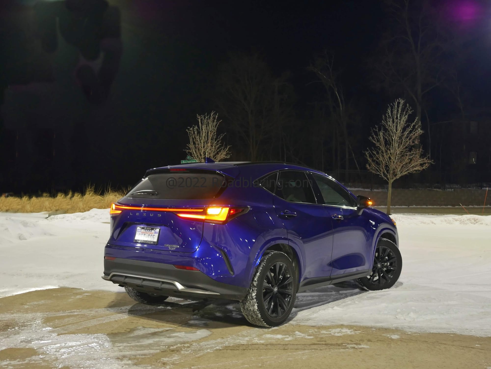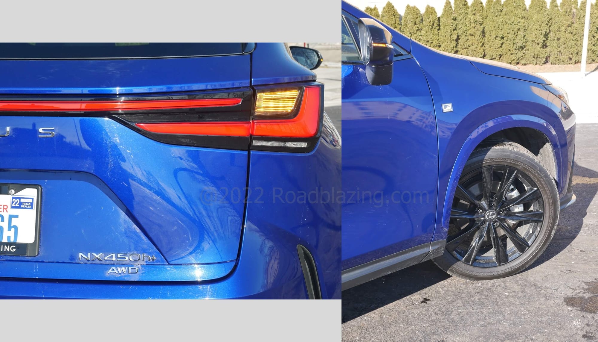 WHAT (A) STYLING DIFFERENCE: The 2022 NX 450+ is the latest Lexus effort at sinewy sharp cinched waist crossover. The greenhouse is taller, C and the rear liftgate Kammback more truck upright. Nonetheless a thin C pillar conveys a sporty floating roof. A dual lateral valley hood clamshells over the fenders. The F-Sport "Spindle Grille" juts out less but still hijacks top to bottom nose real estate. Body character lines, by contrast, are smoothly blended with but a dramatic lower front door scoop. Mid flared rear quarter panels evoke sensuous hips. The tailgate receives a new mid lateral spanning light bar, while "LEXUS" lettering replaces the "L"emblem.