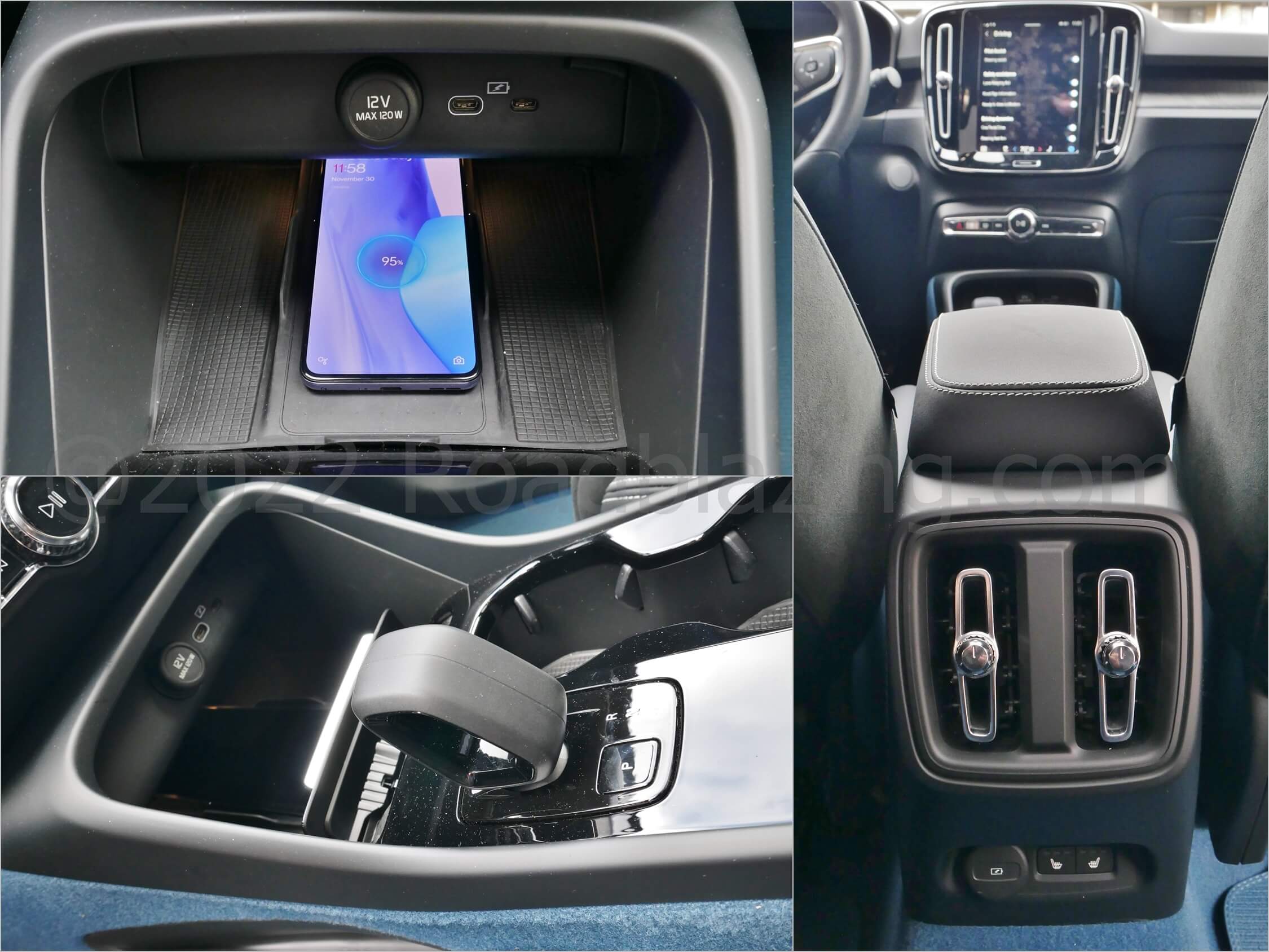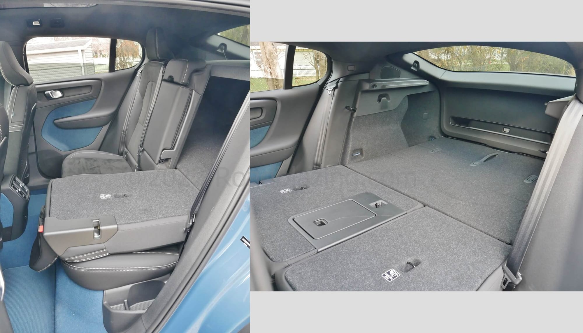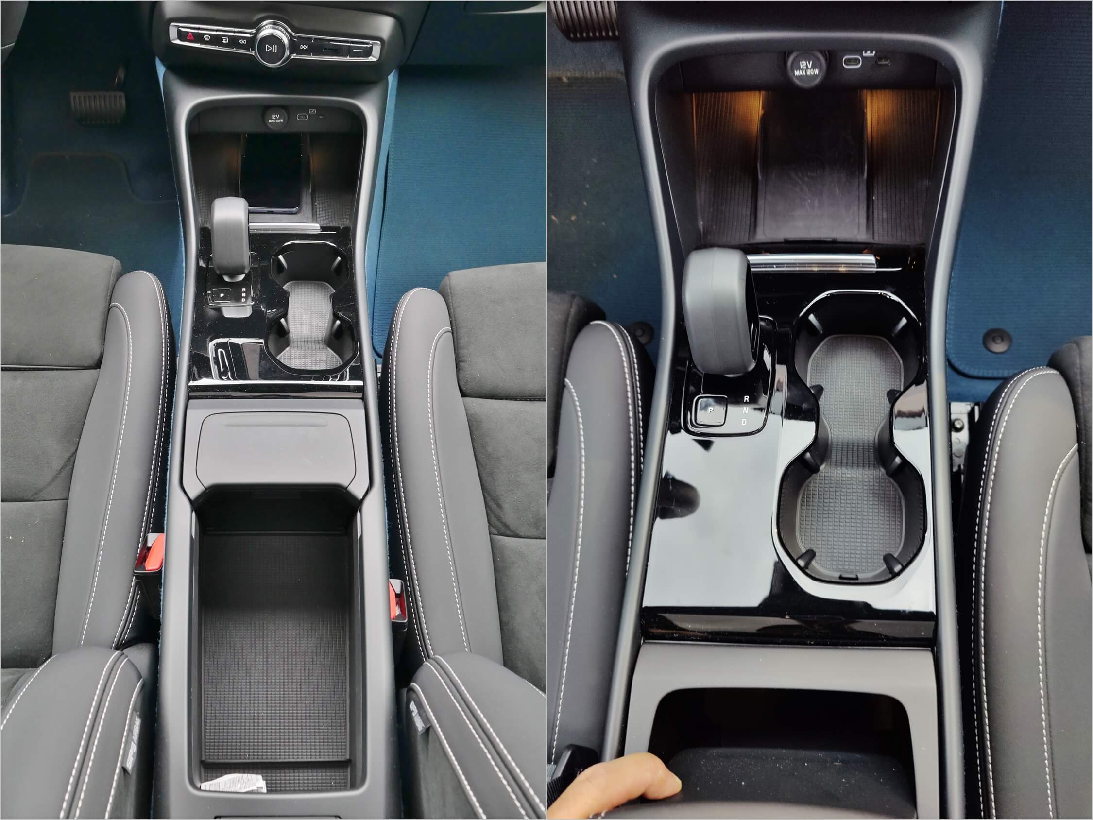 Nearly Non-Descript: -1 Gloss piano black center console control panel bezel; Un-lined center armrest storage bin & glovebox; Flimsy glovebox door & uneven gap; No panorama roof sunshade; Gone is XC40's Swedish flag hood dongle.