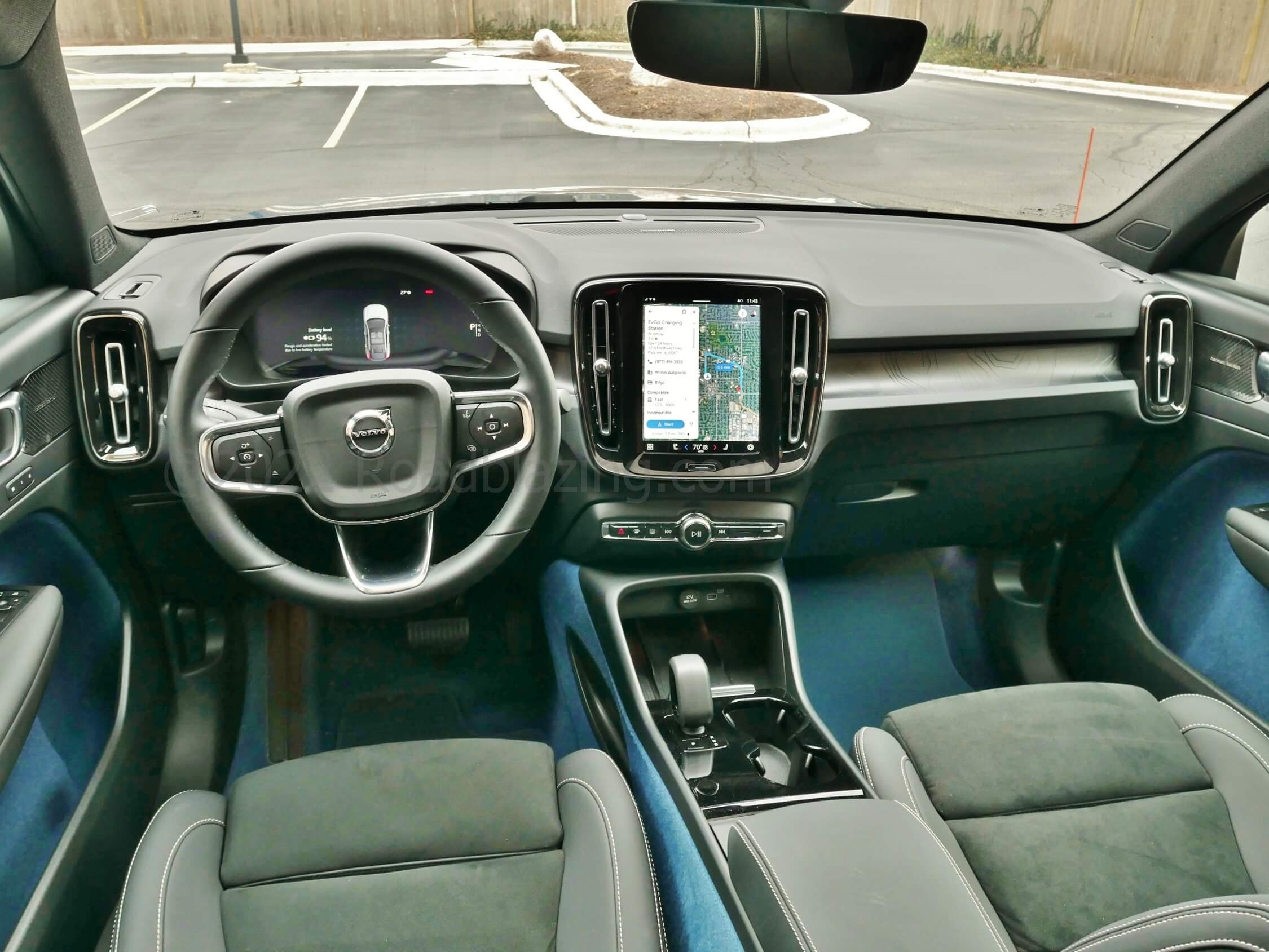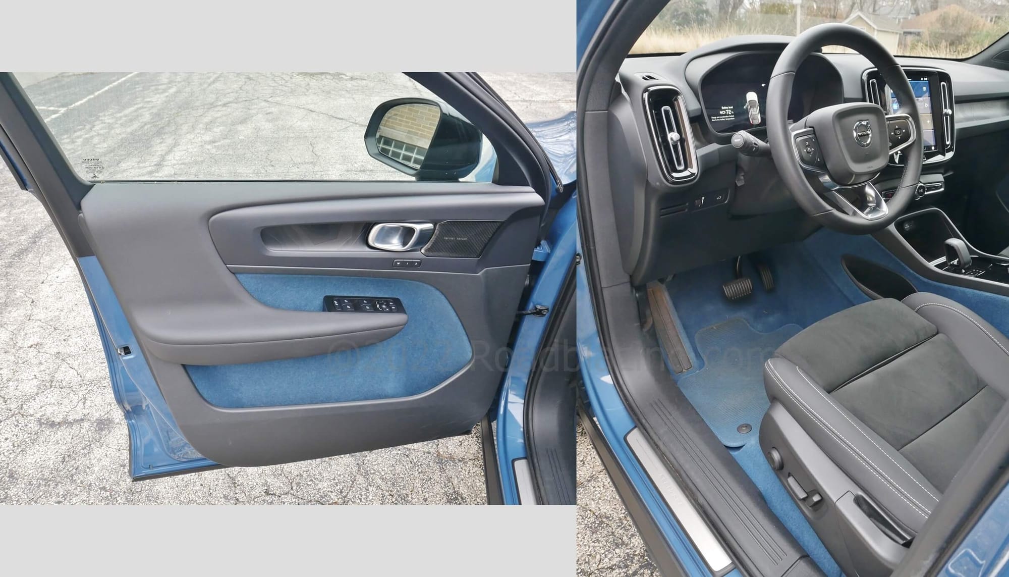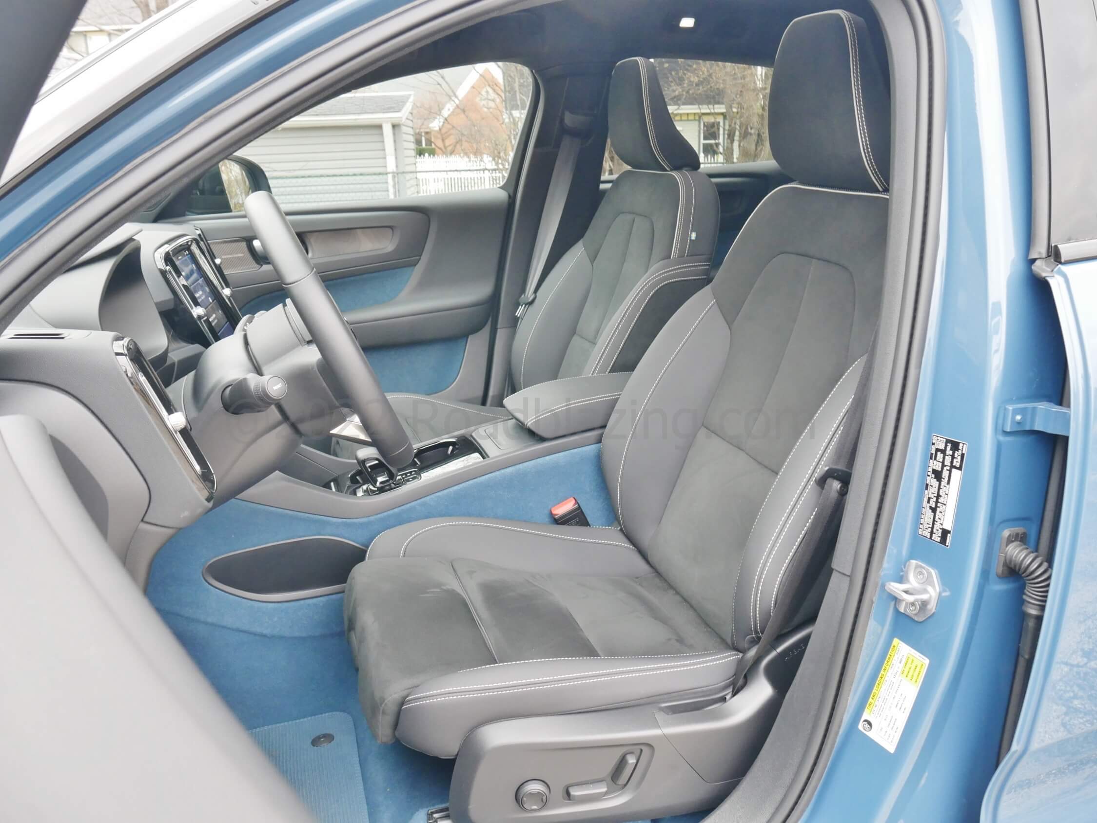 Details Done Right: √ Mircotech vinyl + Nubuck textile seats w/ tandem seating contrasting stitching; √ Front passenger seat back Swedish flag tag; √ Blue flooring and front center tunnel carpeting mimicked in lower door panel felt; √ Aluminum steering wheel, vent, door handle, display bezels & rotary knobs; √ "Topography" dash & door inlays w/ backlighting; √ Dashboard & door panel & footwell ambient LEDs