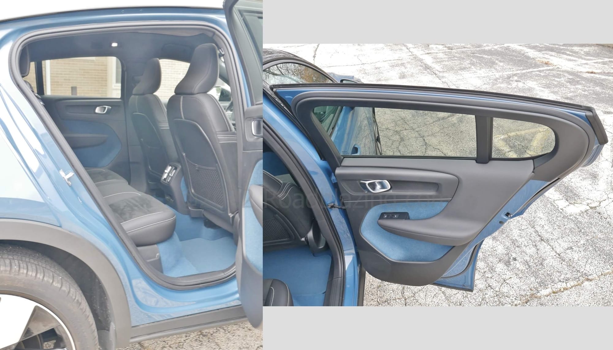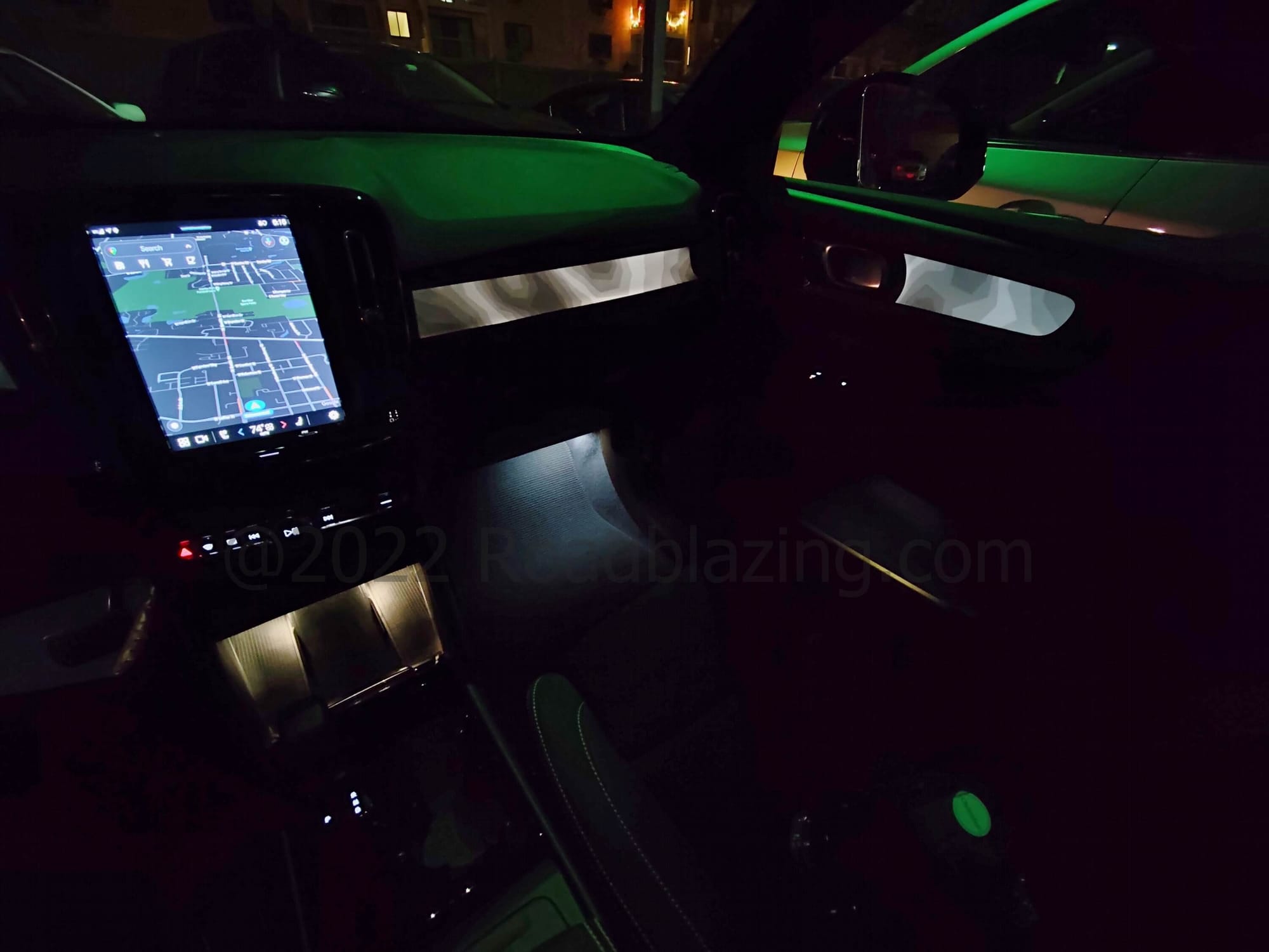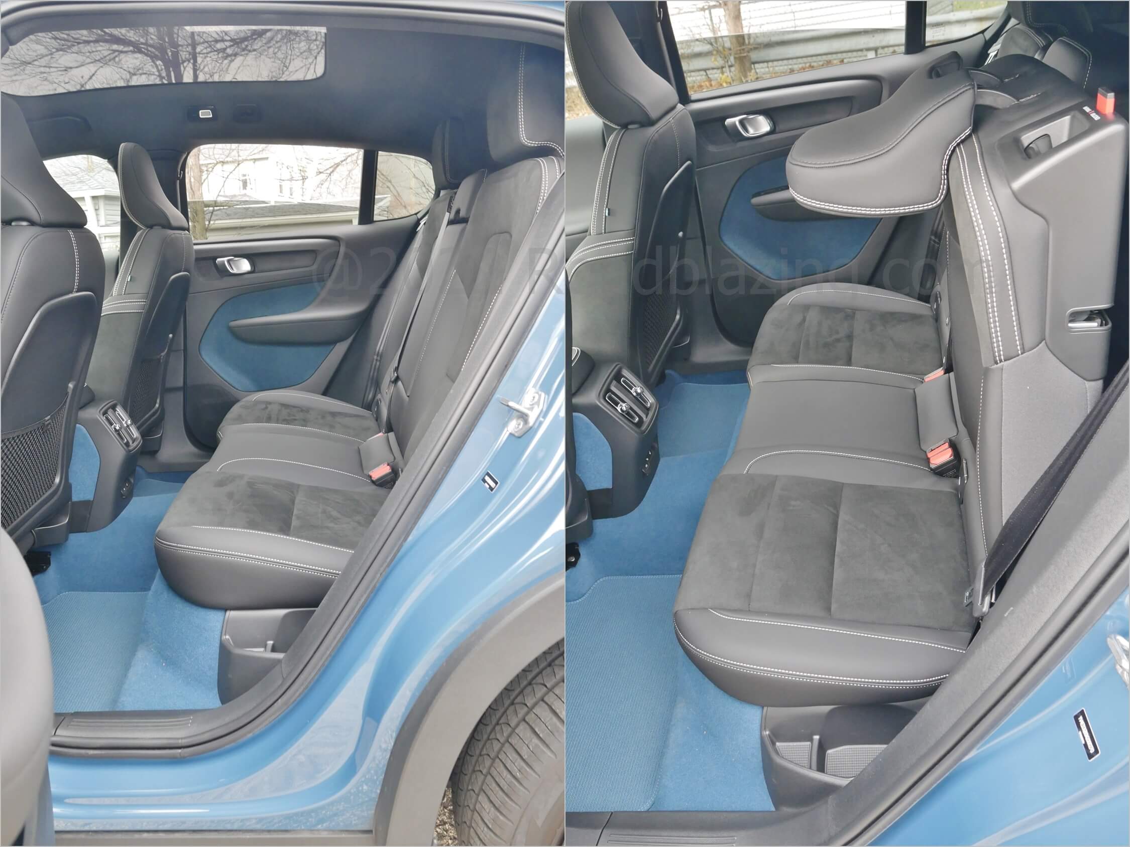 Details Done Right: √ Mircotech vinyl + Nubuck textile seats w/ tandem seating contrasting stitching; √ Front passenger seat back Swedish flag tag; √ Blue flooring and front center tunnel carpeting mimicked in lower door panel felt; √ Aluminum steering wheel, vent, door handle, display bezels & rotary knobs; √ "Topography" dash & door inlays w/ backlighting; √ Dashboard & door panel & footwell ambient LEDs