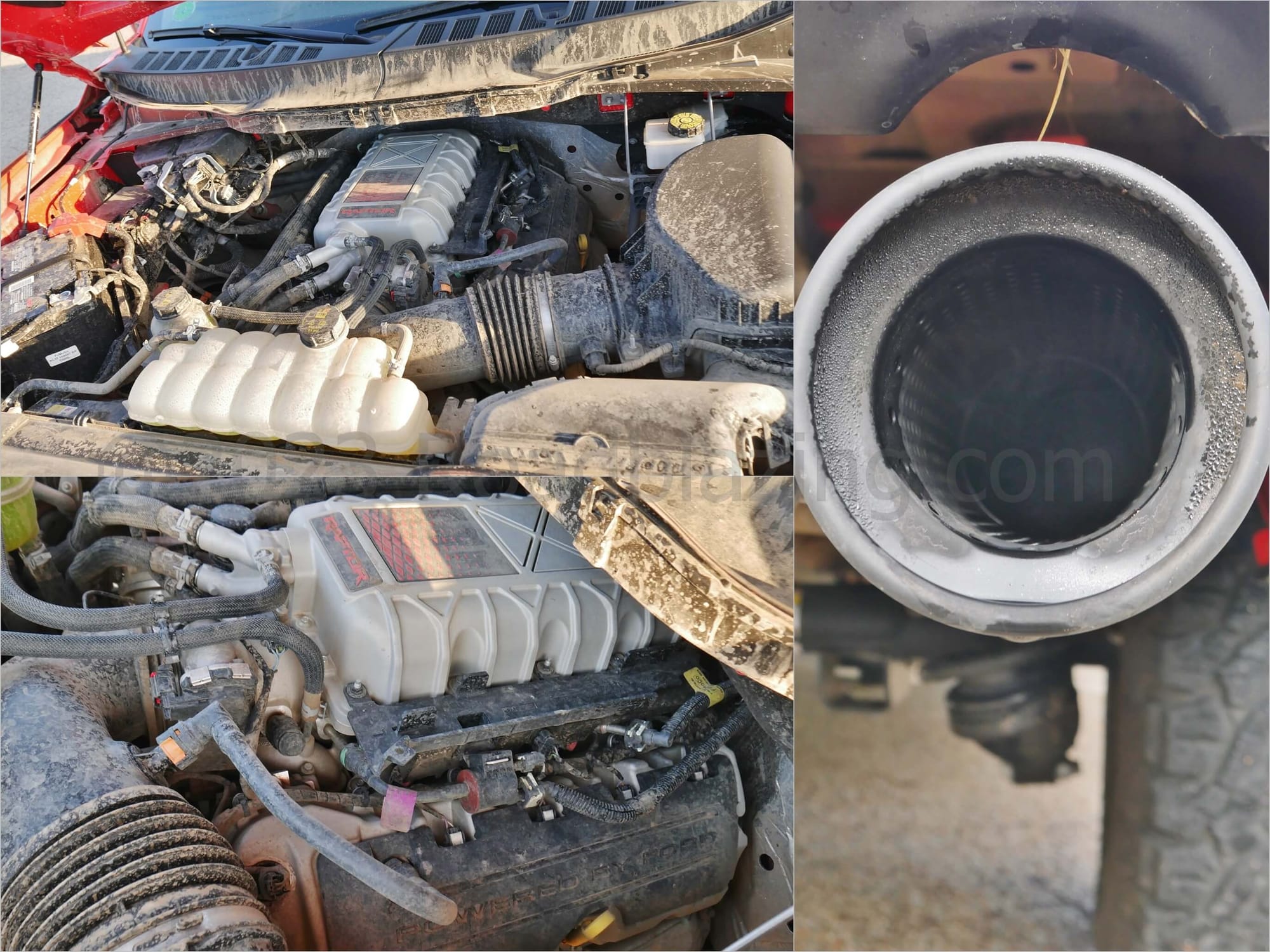 HOW ROAD & OVERTRAIL WORTHY: Without taking away from its smaller engined brother, the Gen. 2.5 Ford F-150 Raptor was born to be stuffed with a supercharged V-8. Certainly, Dearborn was never going to stand still for Sterling Heights' RAM 1500 TRX. While the pushrod Hellcat V-8 comes on quaking and shaking, [in Quiet mode] the F Series Raptor twin-cam "Carnivore" V-8 displays refinement. Tap the steering wheel spoke Active Exhaust switch to move to Normal's rumble, then Sport's throatiness, finally on to Baja's eruption into a "Don't Mess With This" roar. It all makes the every-day F-Series starter push button a downright disappointment.