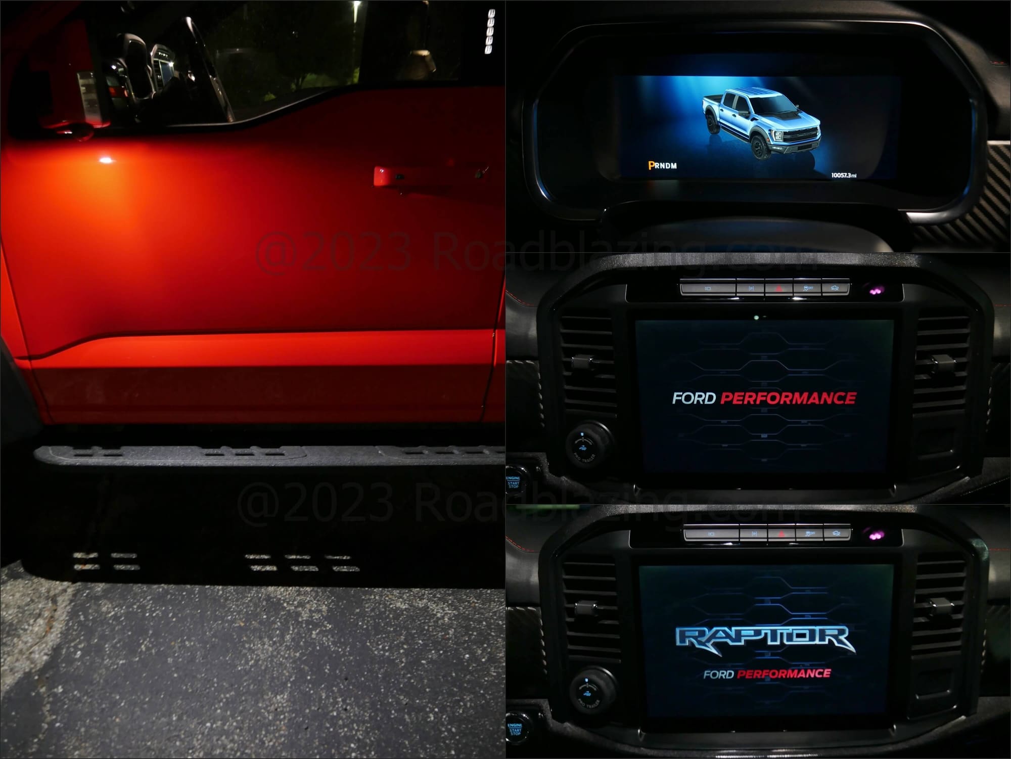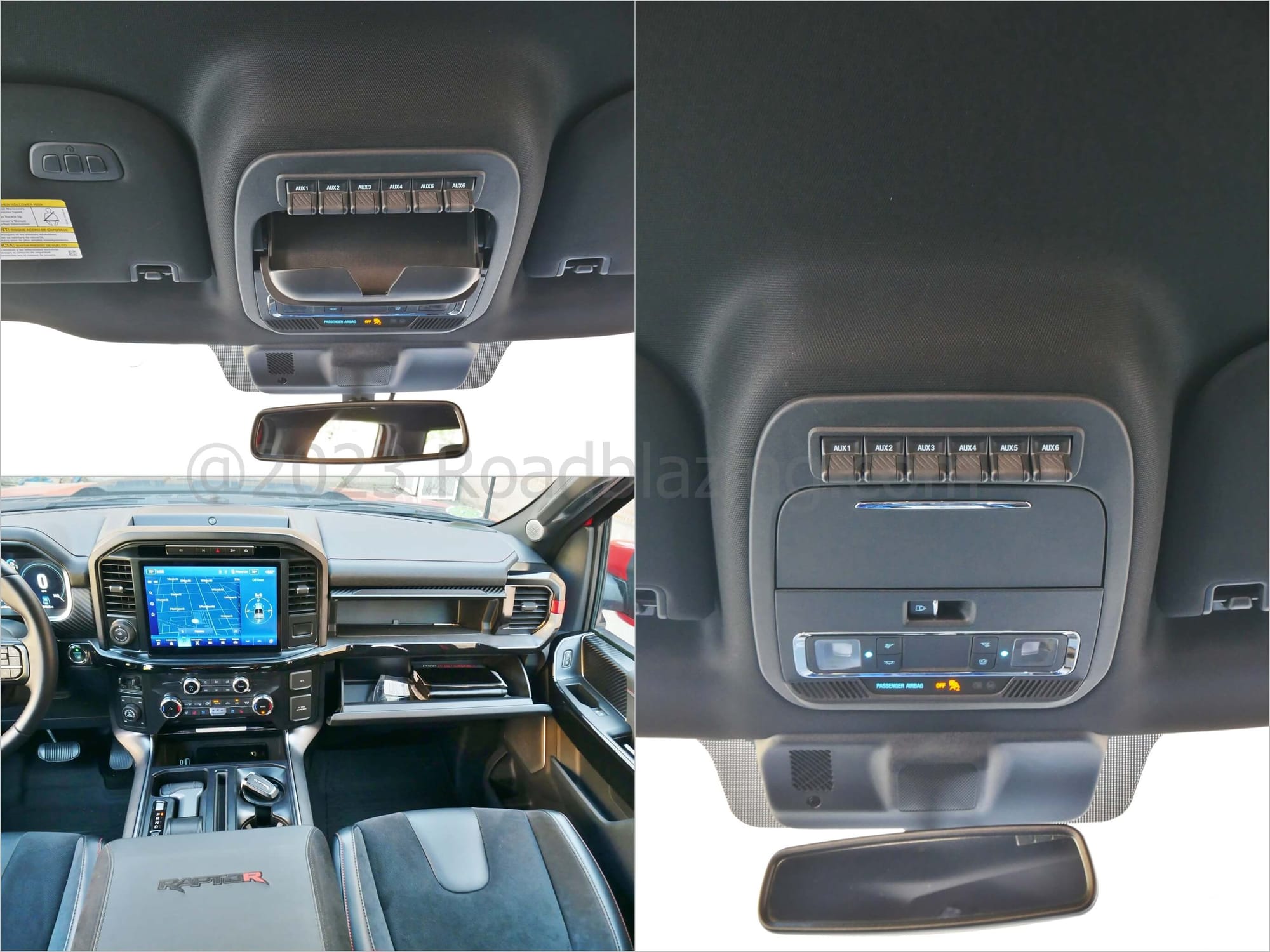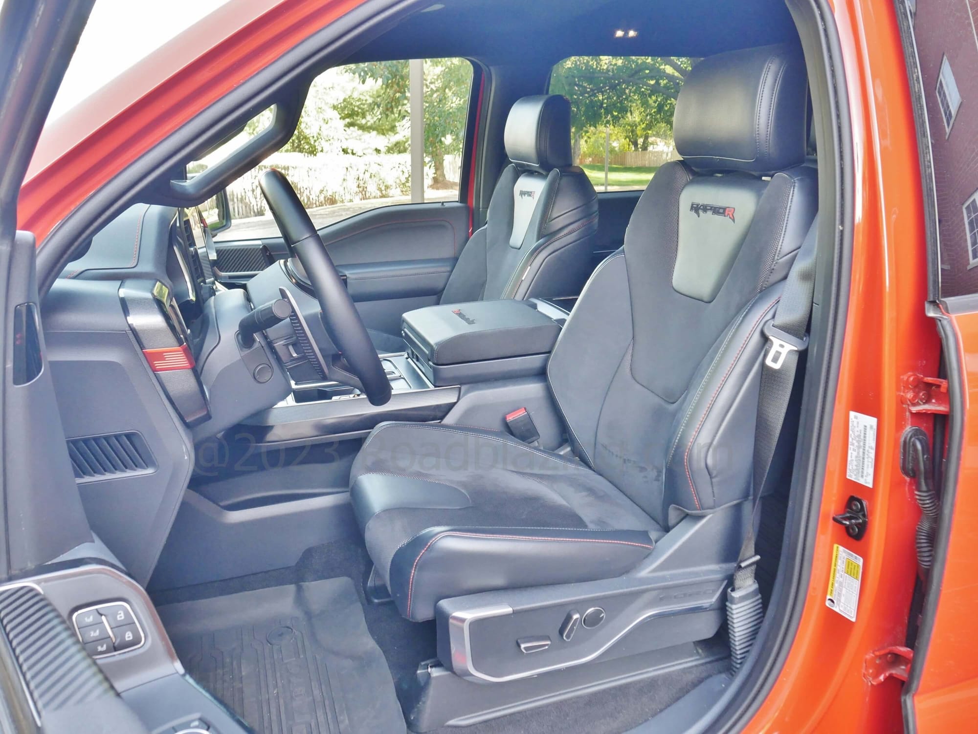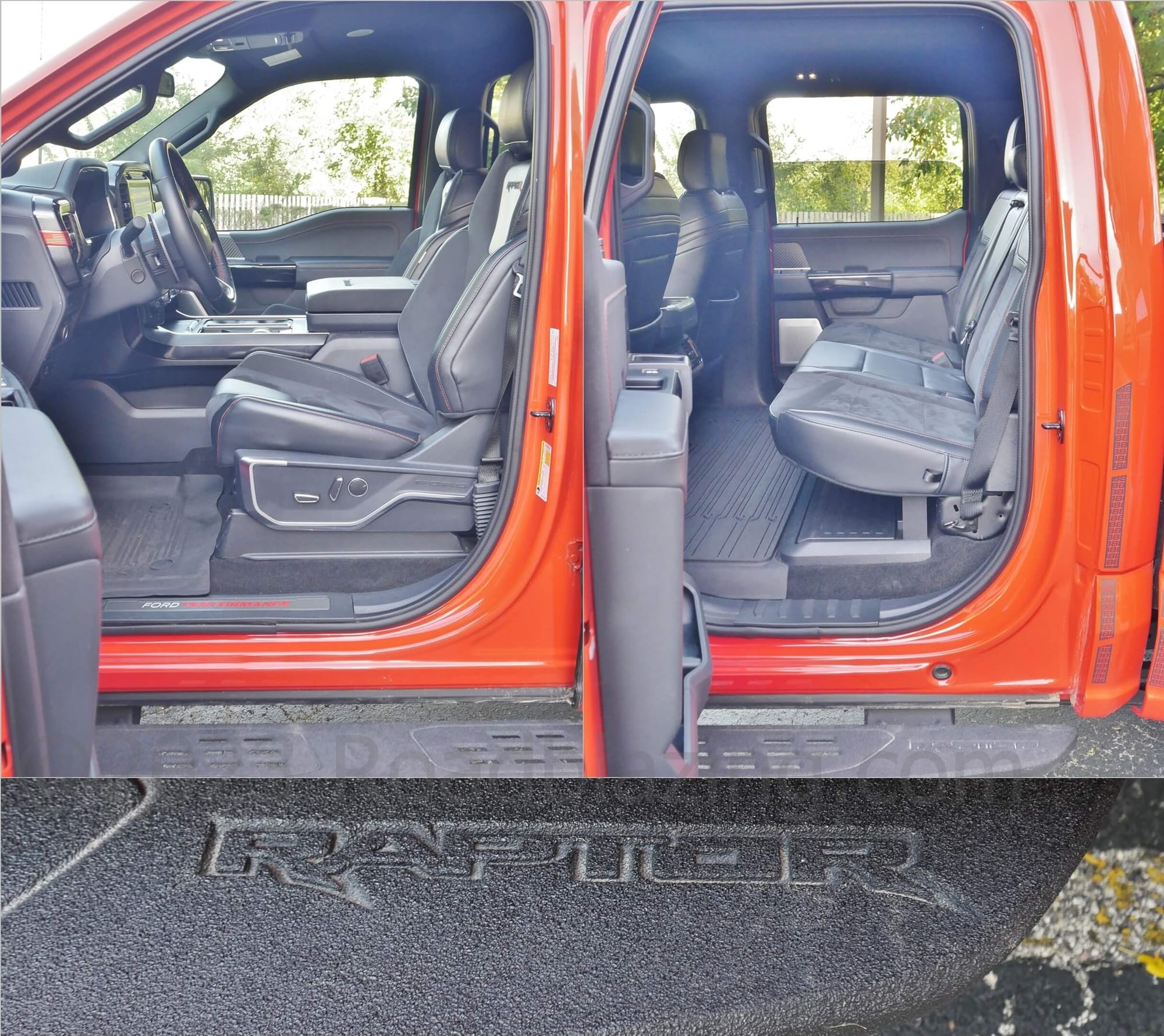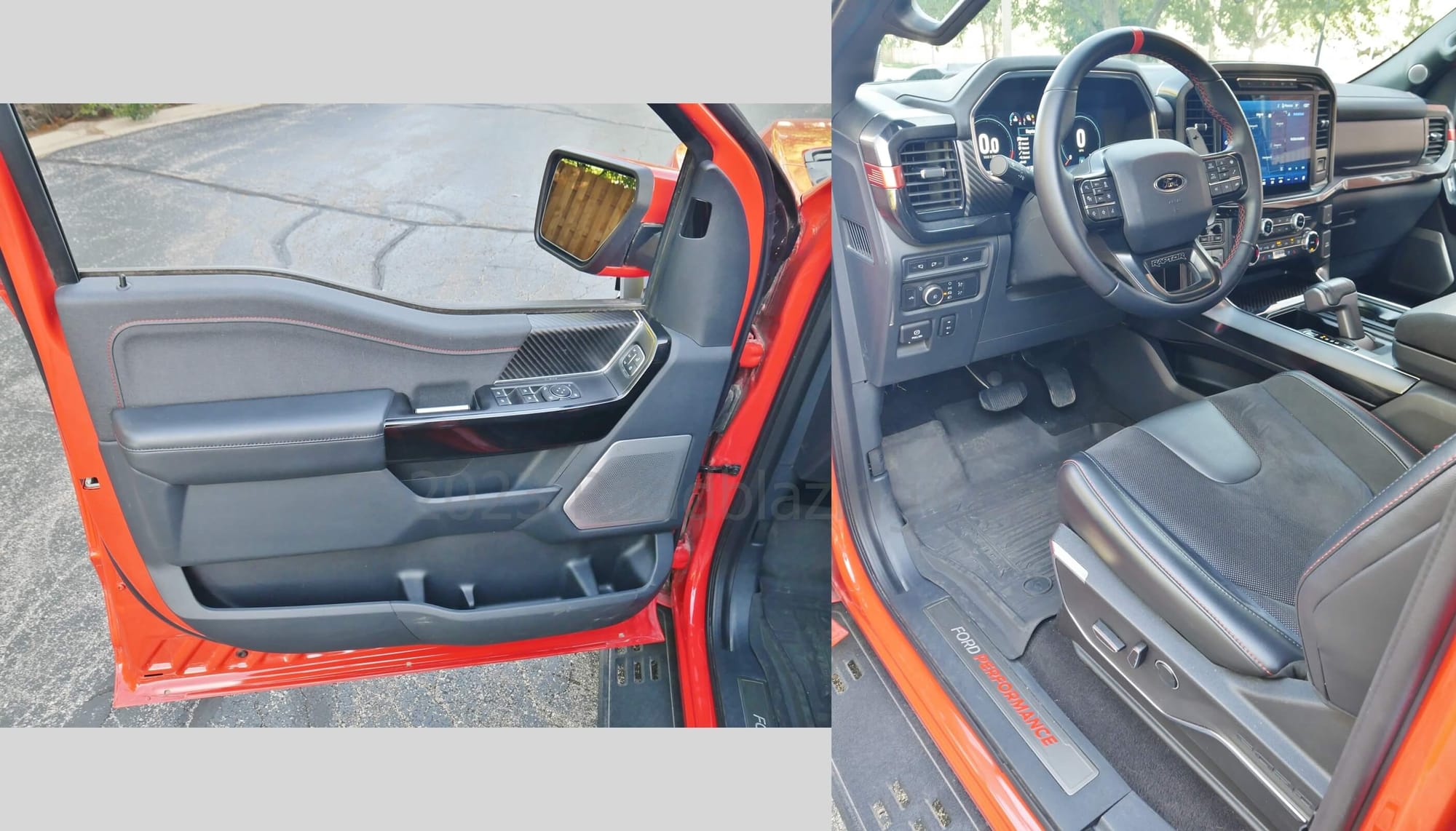 Details Done Right: √ RAPTOR embroidered upper front seat + center console bin lid; √ Red contrast stitching; √ Carbon fiber middle dasboard, door card, console appliques; √ Tight webbed headliner; √ Blue ambient cabin night illumination