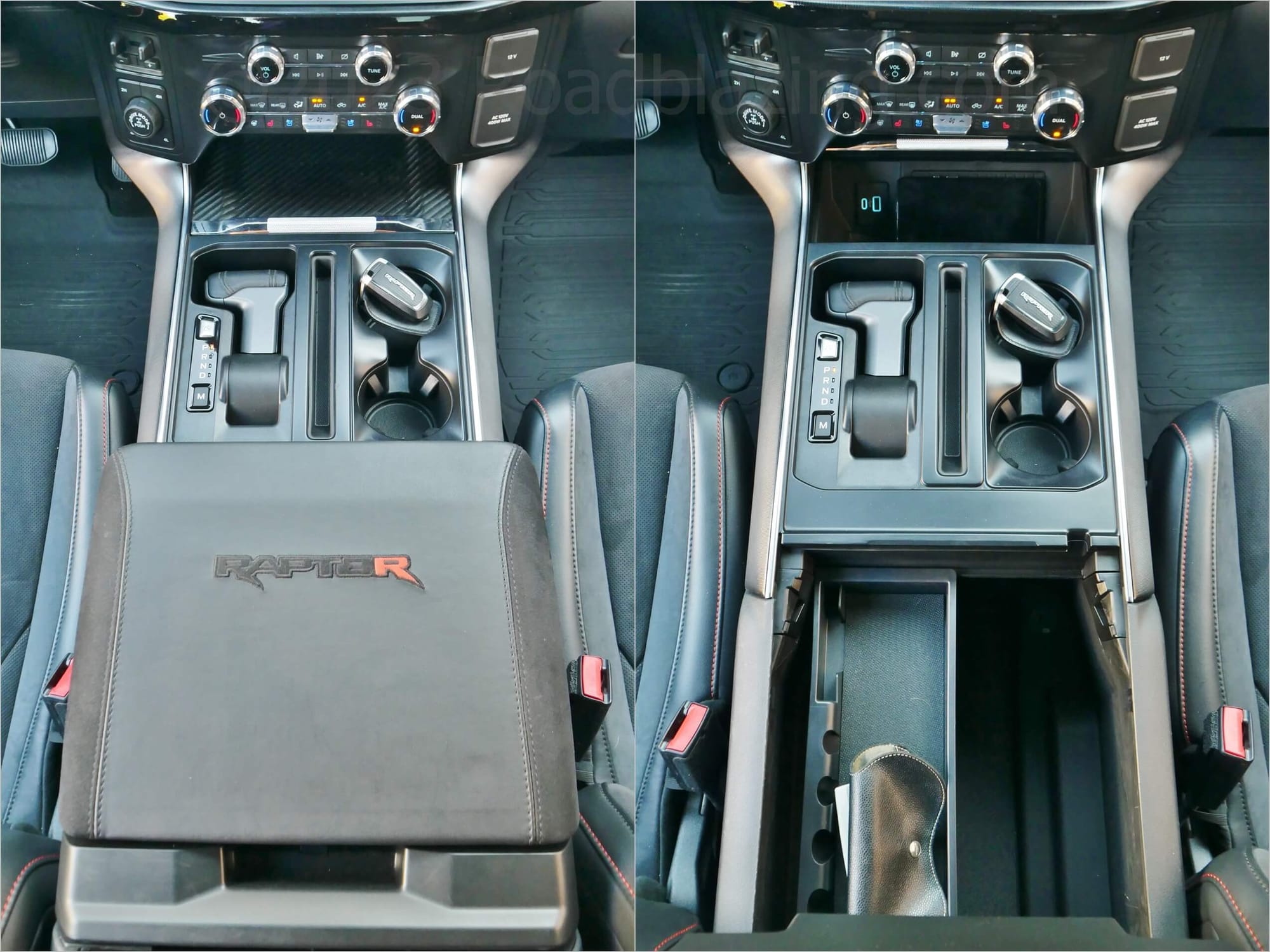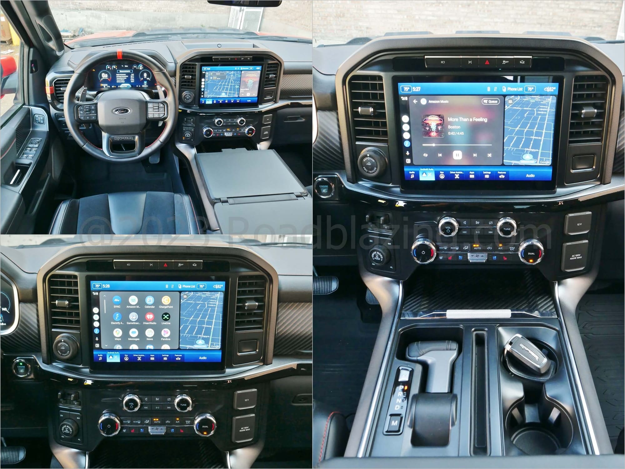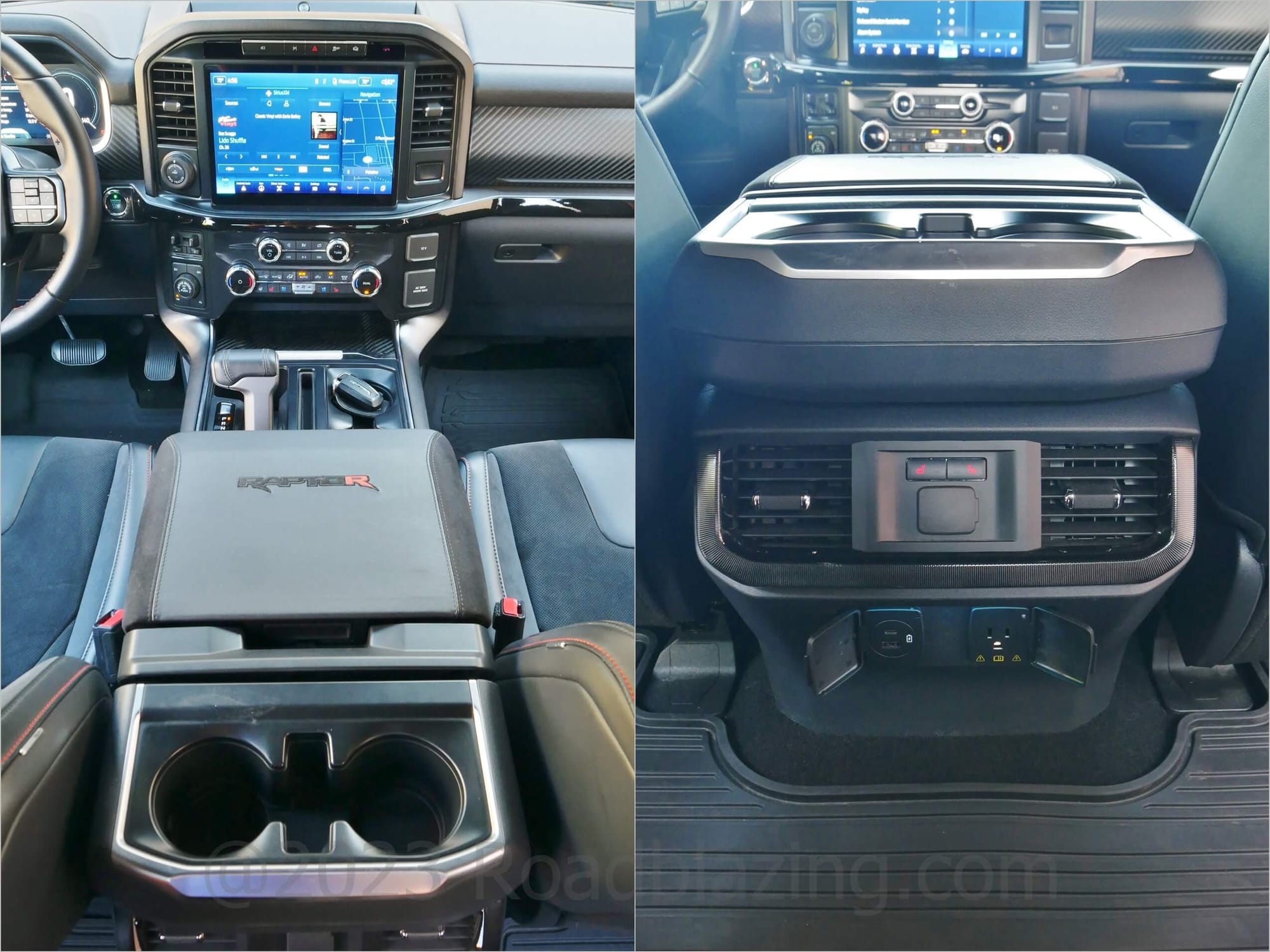 2023 Ford F-150 Raptor R 4x4: modern interpretation of sporty work truck cockpit including power folding transmission lever, fold-over work table; MyFord Sync 4 touch & conversational infotainment, Android Auto & Apple CarPlay projection