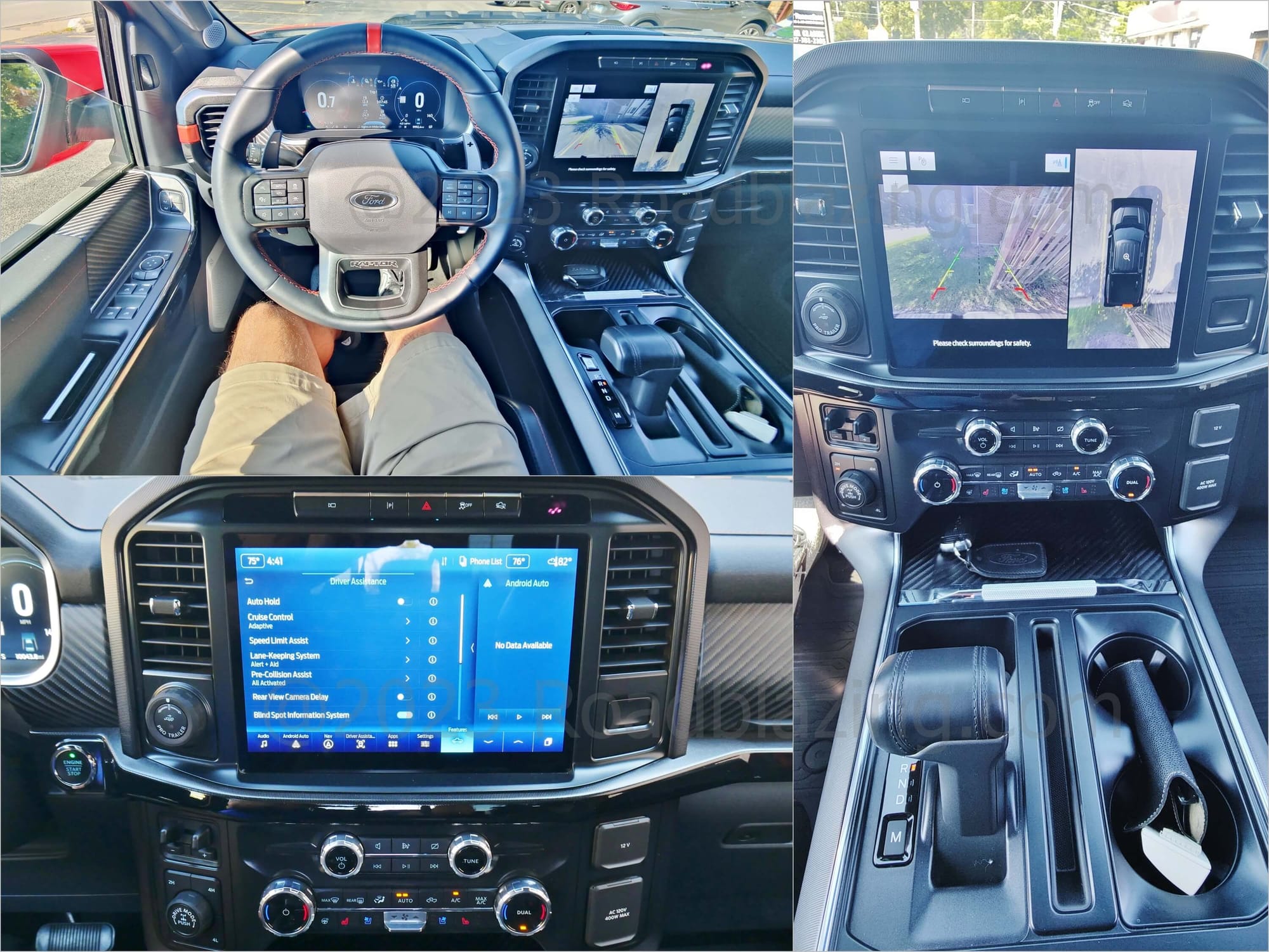 Displays emphasize typically Ford blue & green hues. A red stripe is planted on the sport steering wheel at six o'clock. Front seat uppers & center arm rest merit Raptor "R" embossing. Splashes of carbon fiber and satin metallic banding are here and there. However, little about the cabin achieves presentation status as in the posh & glam RAM 1500 TRX .