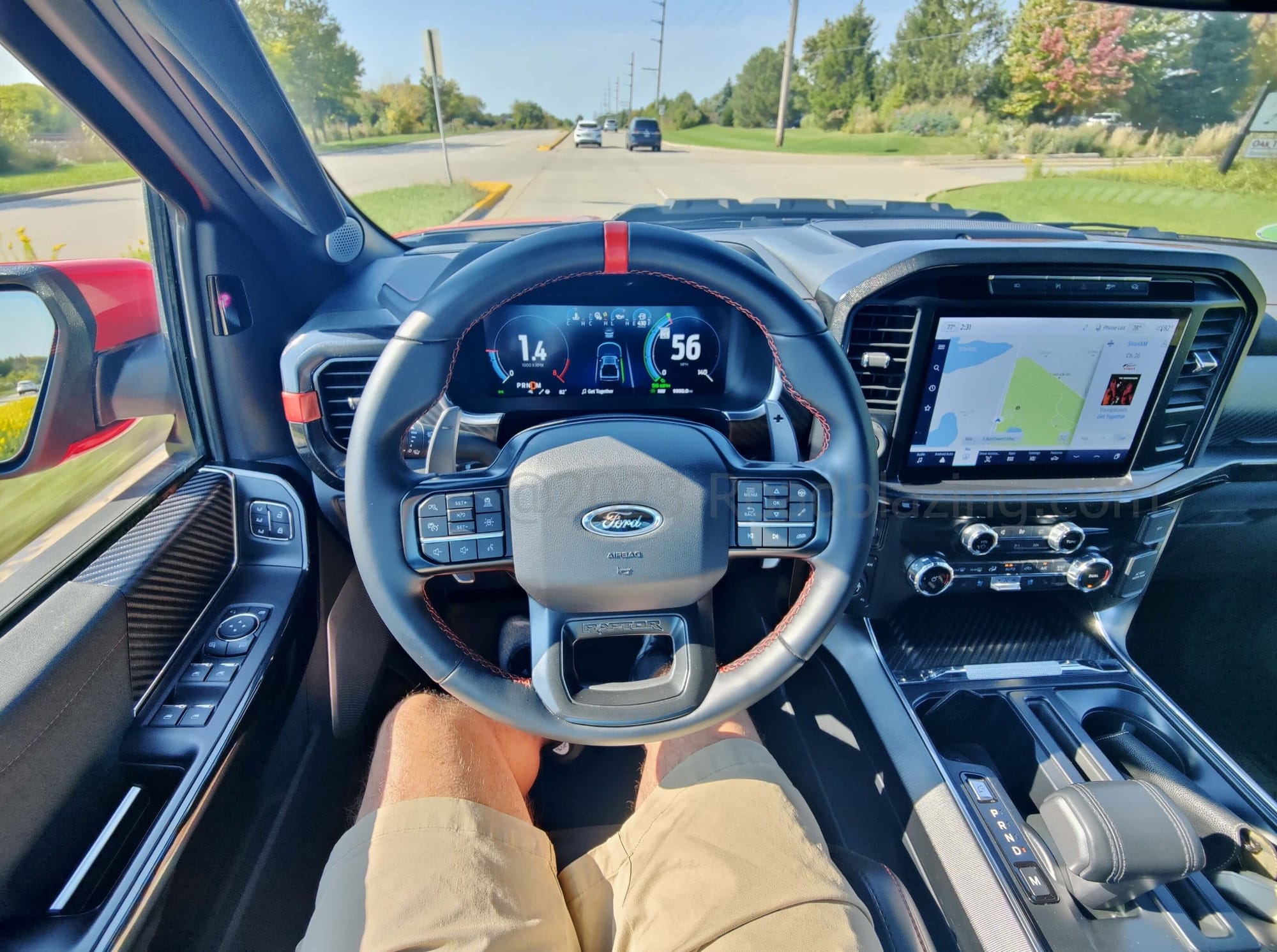 HOW FRIENDLY: It's hard to argue with the intuitive utility of the current F-Series cockpit, with a bevy of performance data readouts and cluster menus, amply large pockets, bins and trays. Who doesn't like the power folding T-shifter which makes way for the fold-out center console Work Surface junior picnic table? And MyFord Sync 4.0A for the most part, runs glitch free and fast in infotainment operation. The low door window sills and cowl impart a commanding driving position. Even some grippy Recaro front bucket seats found their way into the 2023 Ford F-150 Raptor R .