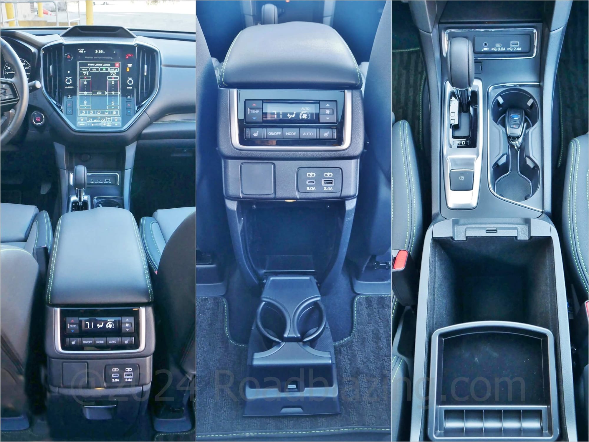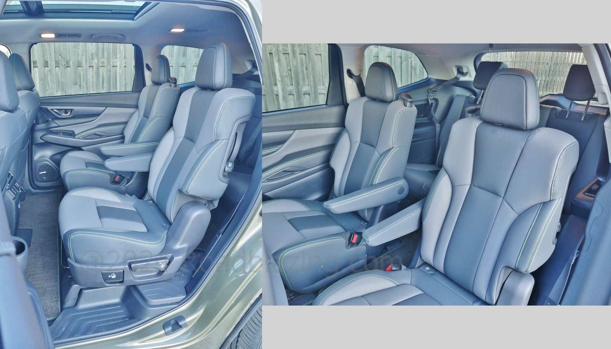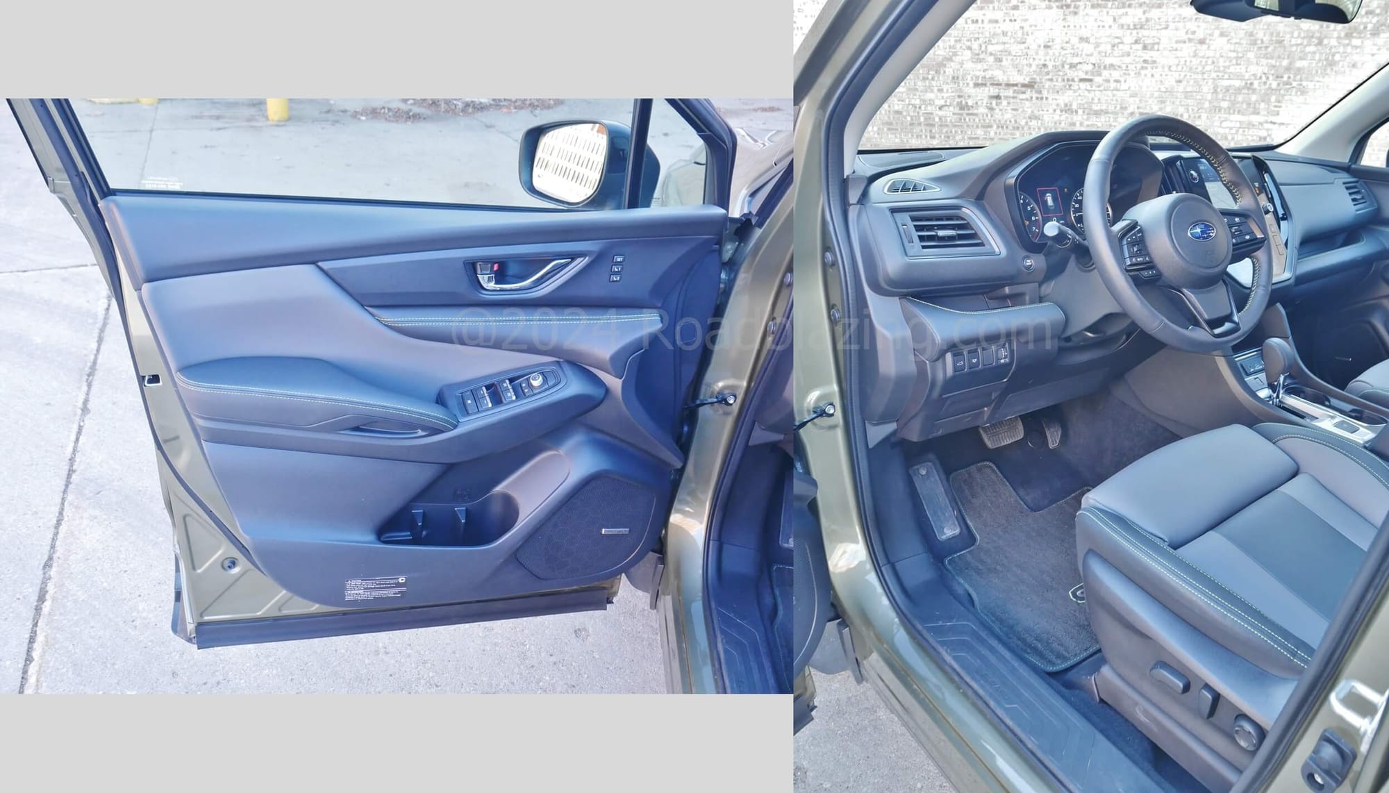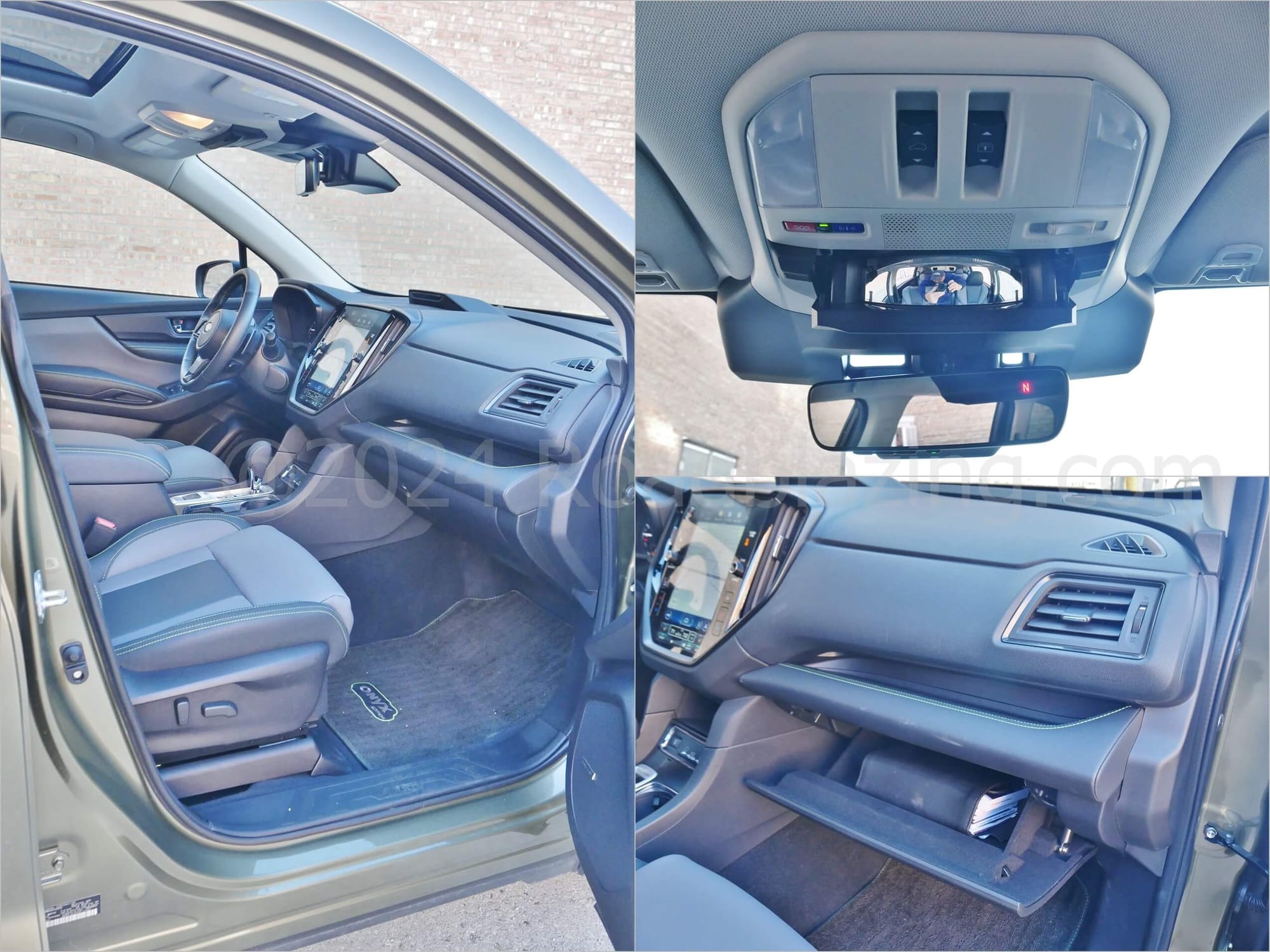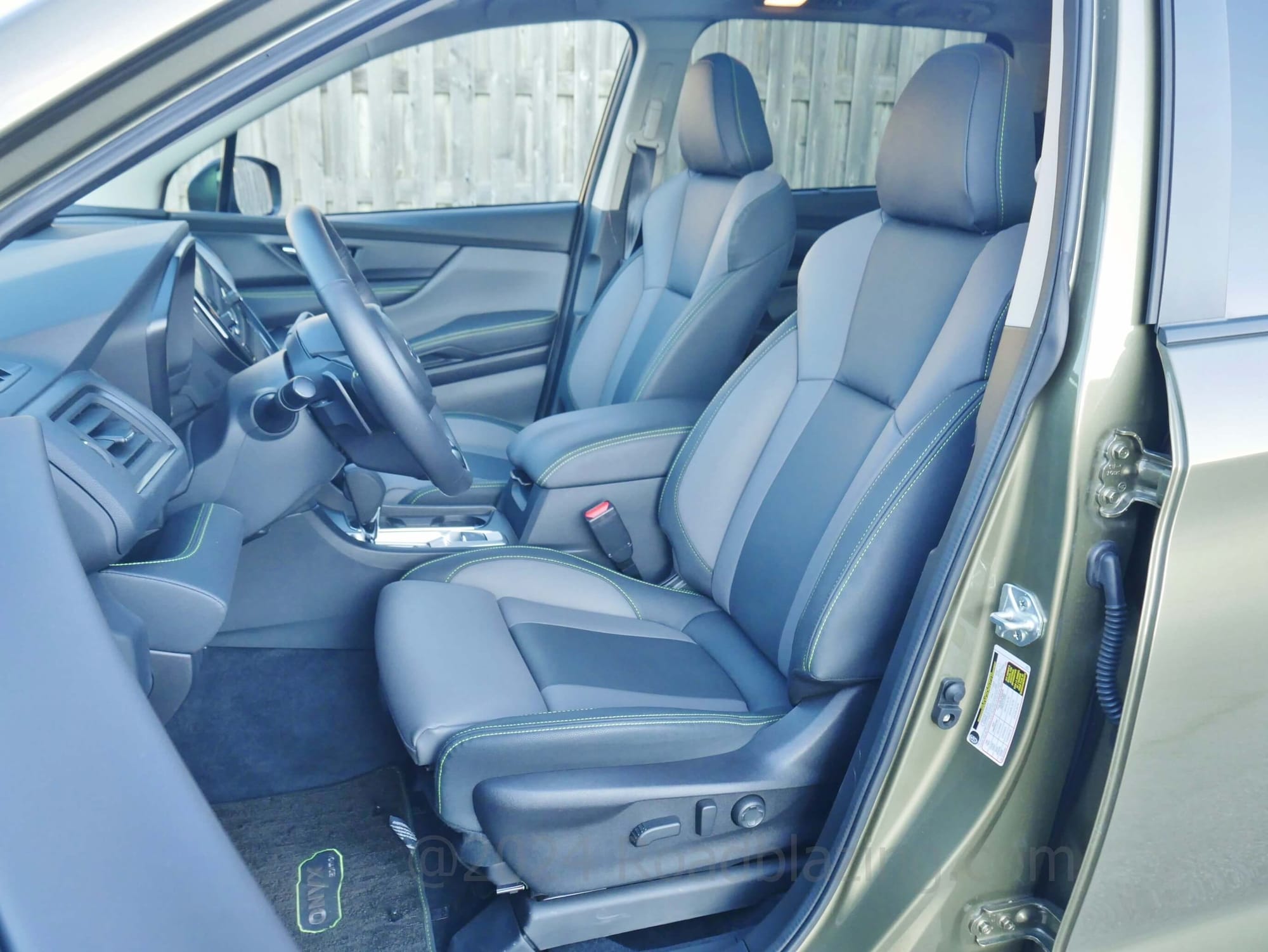 HOW PEOPLE FRIENDLY:2023 Subaru Ascent Onyx does the brand's REI seating area semi luxe. Olive drab plush parts come bordered with stark canary yellow contrast stitching. Credit the cream colored headliner for the enhanced sensation of spacious. Instrumentation sticks with tried and true white backlit ELD twin dial analog split by a busy LED trip / function meter. A large gloss portrait LCD media display fills the center stack, retaining rotary audio volume & tuning knobs, while digitizing climate settings. In idiosyncratic Subaru form, a steering wheel spoke hanging chad remains for steering heat switches between the right side horizontal and vertical spokes.