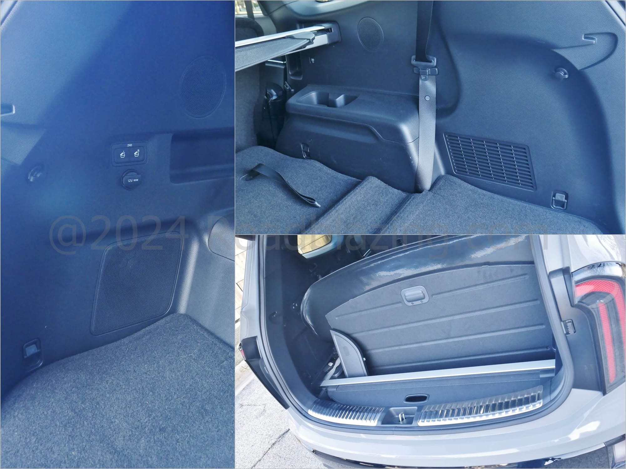 - UTILITY: √ 50:50% split 3rd Row folding seat backs + release straps; √ Available 2nd Row captain's chair bucket seating w/ power one-touch fold & slide; √ Cargo bay wall switches for powered 2nd Row seatback release to fold; √ Variable height power liftgate;(available per trim) √ Large lower center stack wireless device tray; √ Left side dashboard mouse fur-lined storage drawer.