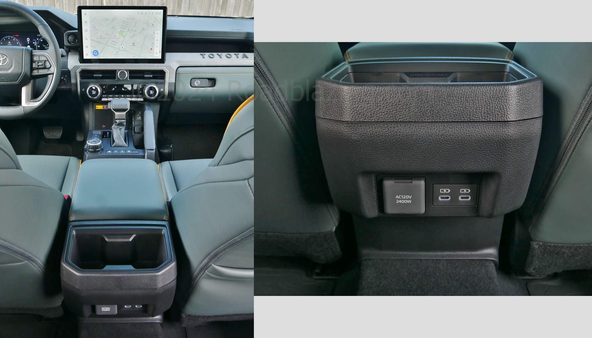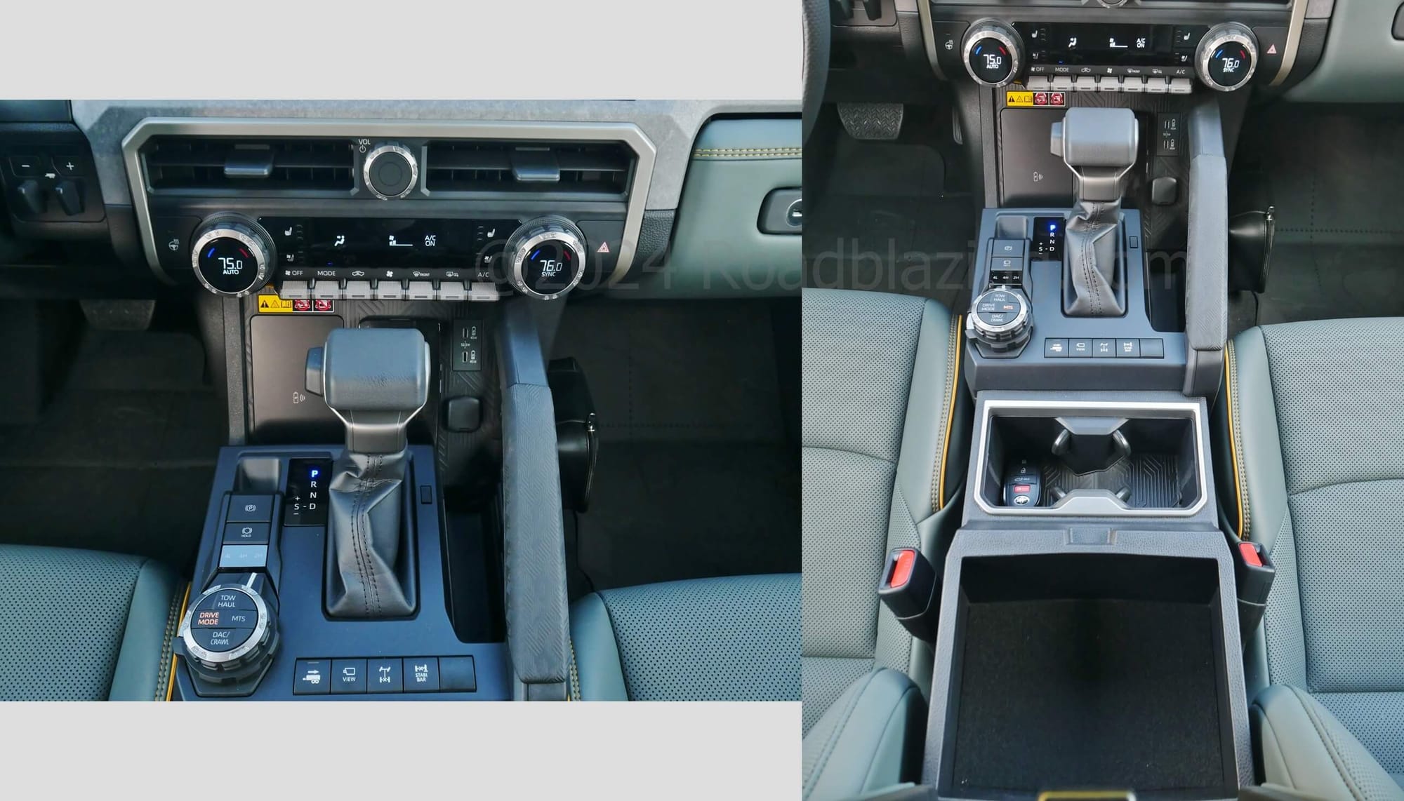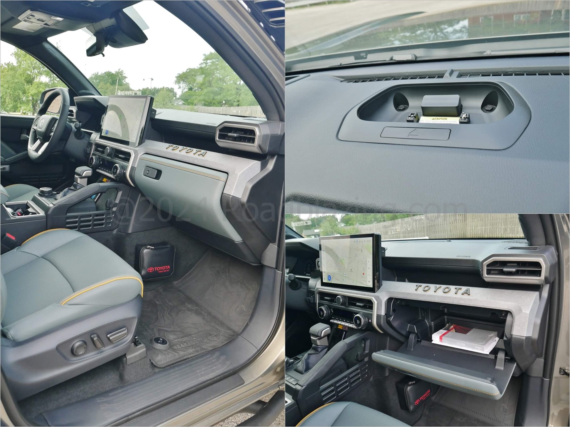 HOW FRIENDLY: Twenty-first century Toyota truck occupant modernity finally drapes the new Tacoma's cabin. Gauges & screens have grown massively and controls have been condensed into more ruggedized knobs and shift levers. The age old parking brake hand lever is replaced by a e-toggle switch, freeing up considerable center console space, adding a passenger side grab handle. Contrasting finishes appear in a tiered dashboard, padded glovebox and door cards, shiny bezel corner climate ducts and tandem contrast stitching.