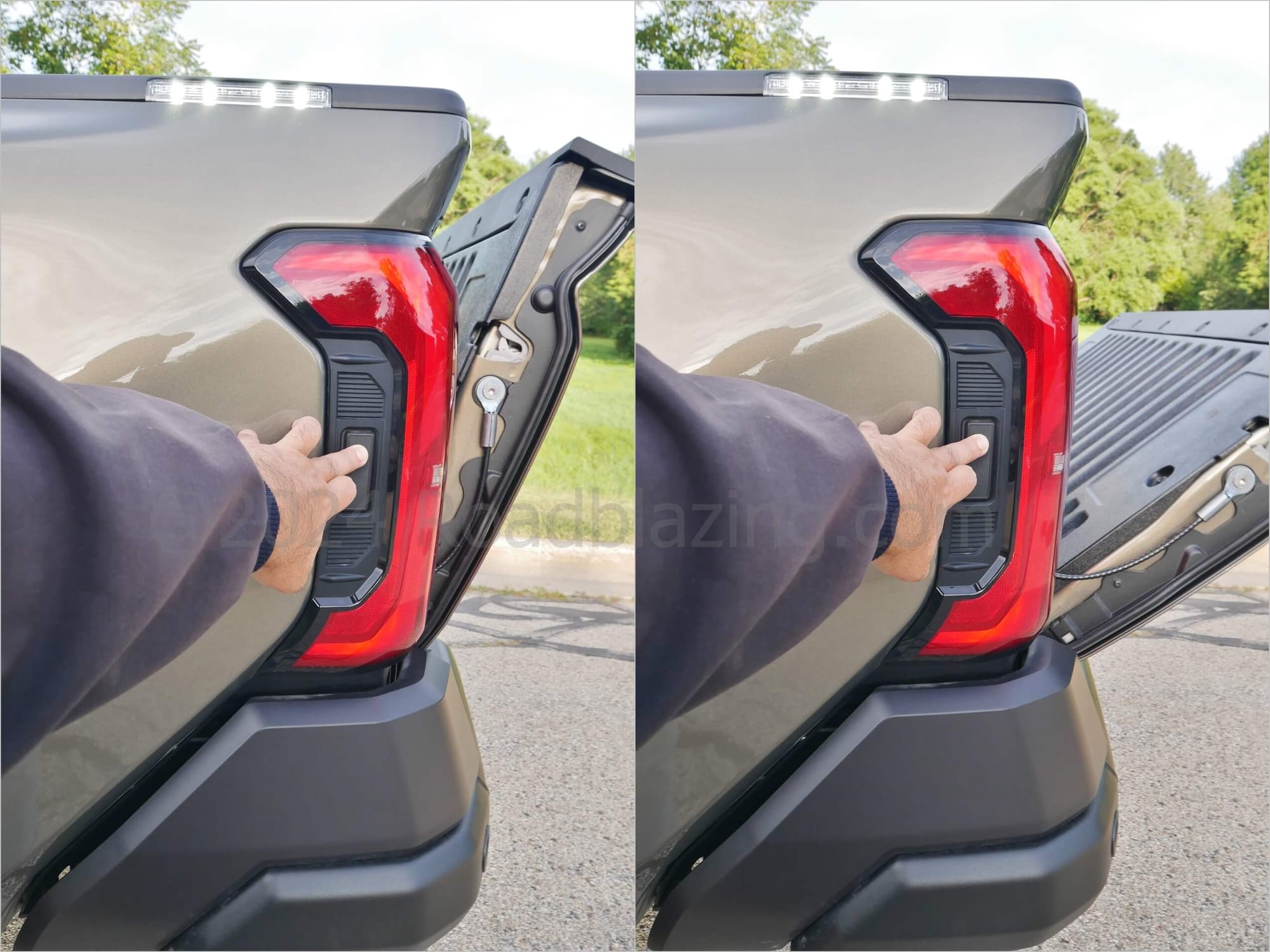 An upper spoiler lip has been retained, though, an upper grab lip has been added to a revised liftgate. Bold dark contrast TACOMA lettering is stamped in the middle. New outboard "C" taillamps (similar to Ford F Series), cleverly incorporate redundant outboard pushbutton releases for the power liftgate. The lower rear quarter panel cants forward to the bottom of the rear wheel arch, making room for more powerful corner bumper folds. The center bumper step area, descends in a marked bowl below the bumper line.