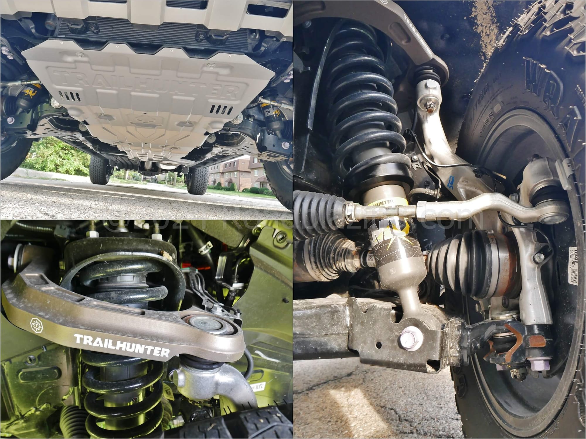 Suspension: FRONT double wishbone, coil springs over 2.5" Old Man Emu End Zone Control dampers, auto disconnecting stabilizer bar + ; REAR: solid axle, coil springs, panhard rod, 2.5" Old Man Emu external reservoir dampers