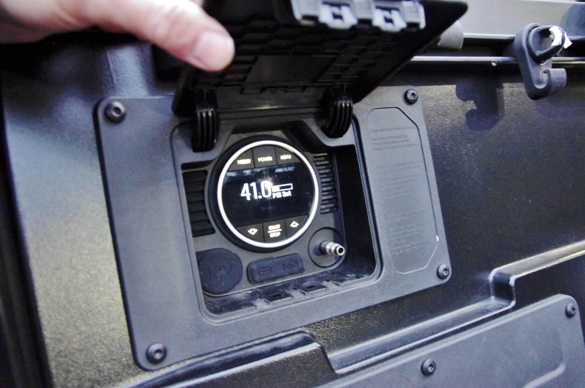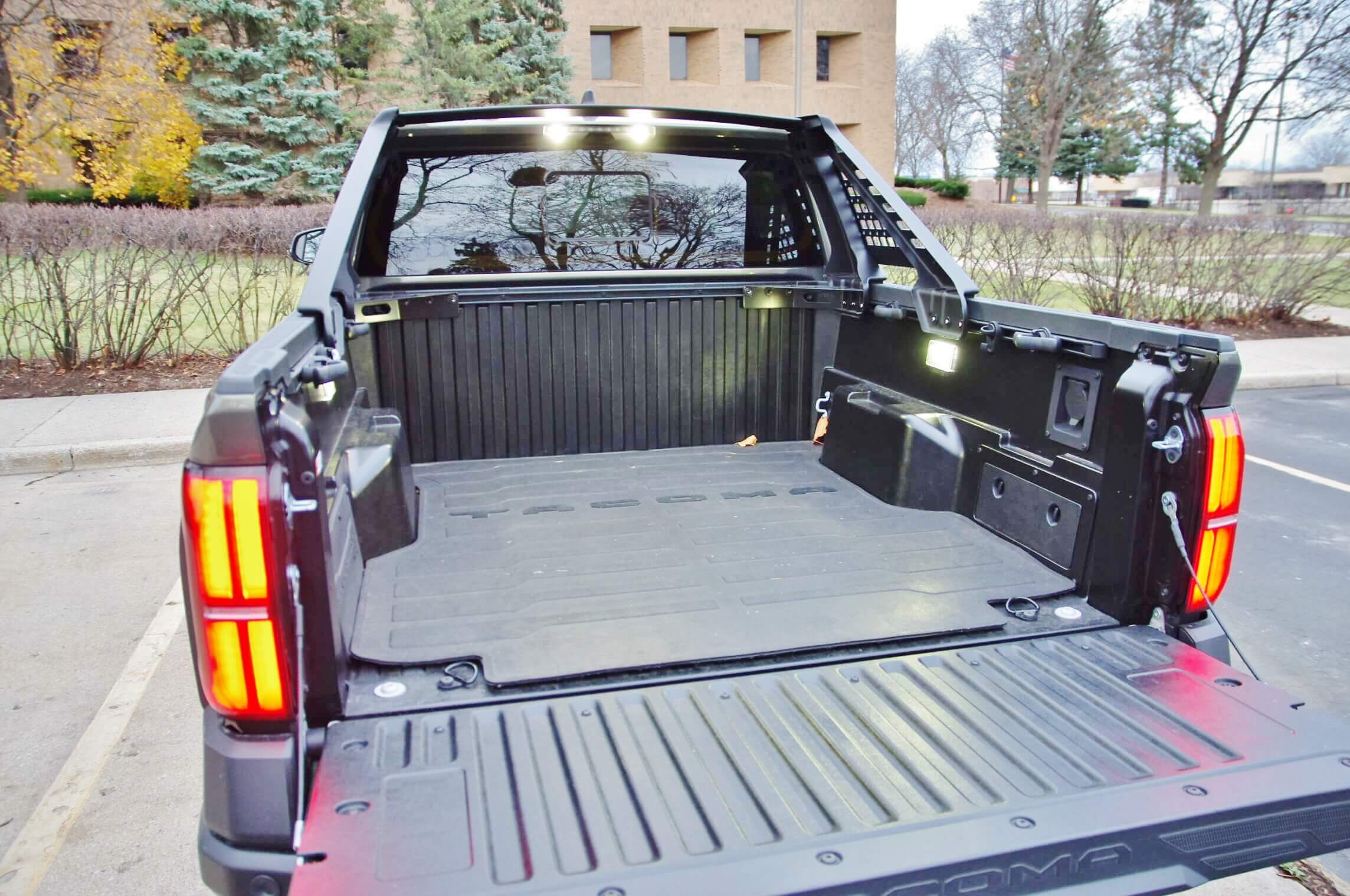 The tested double cab Tacoma Trailhunter was equipped with the short five foot cargo box, and a power sliding backlight aperture. In addition to the typical power outlet, J-track anchors, and LED lighting there are also an innovative on-board air-compressor and dual side activated power liftgate buttons. For night-time truck loading there is perimeter lighting.