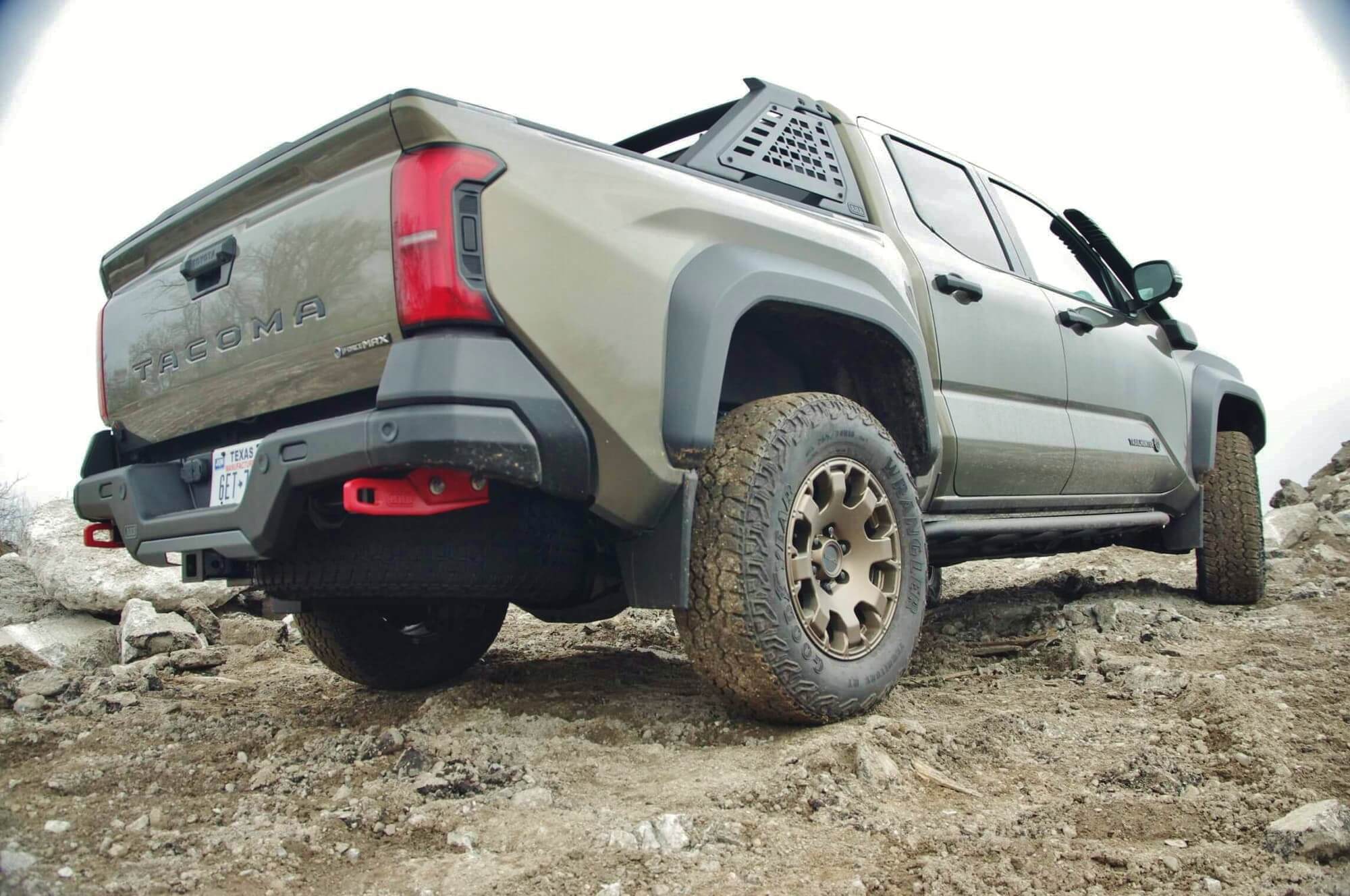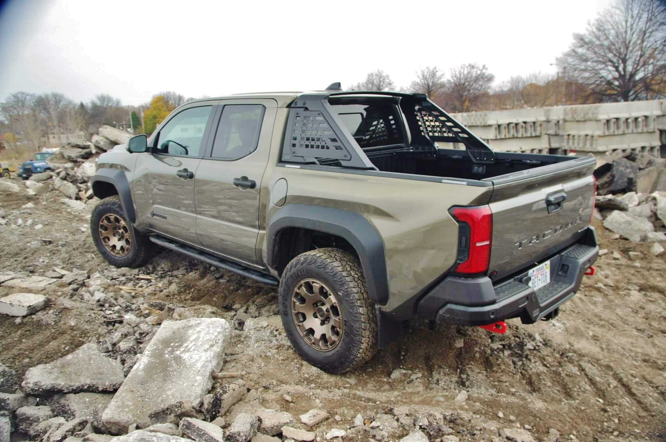- Given the selectable, rather than automatic four-wheel drive of the 2024 Toyota Tacoma Trailhunter, it was easy to loaf on snowy streets in rear-wheel drive. For some off-road antics, editors headed over to what was once Wisconsin’s largest Buick dealer: Rank & Sons. With the dealership buildings turned into rubble, and low four-wheel drive low dialed up, crawl mode allowed to Tacoma sure-footedly descend a muddy path. The automatically activating Multi-Terrain Monitor provided a bird's-eye view of the trail sufficient to avoid some jagged concrete obstacles encountered in the approach.