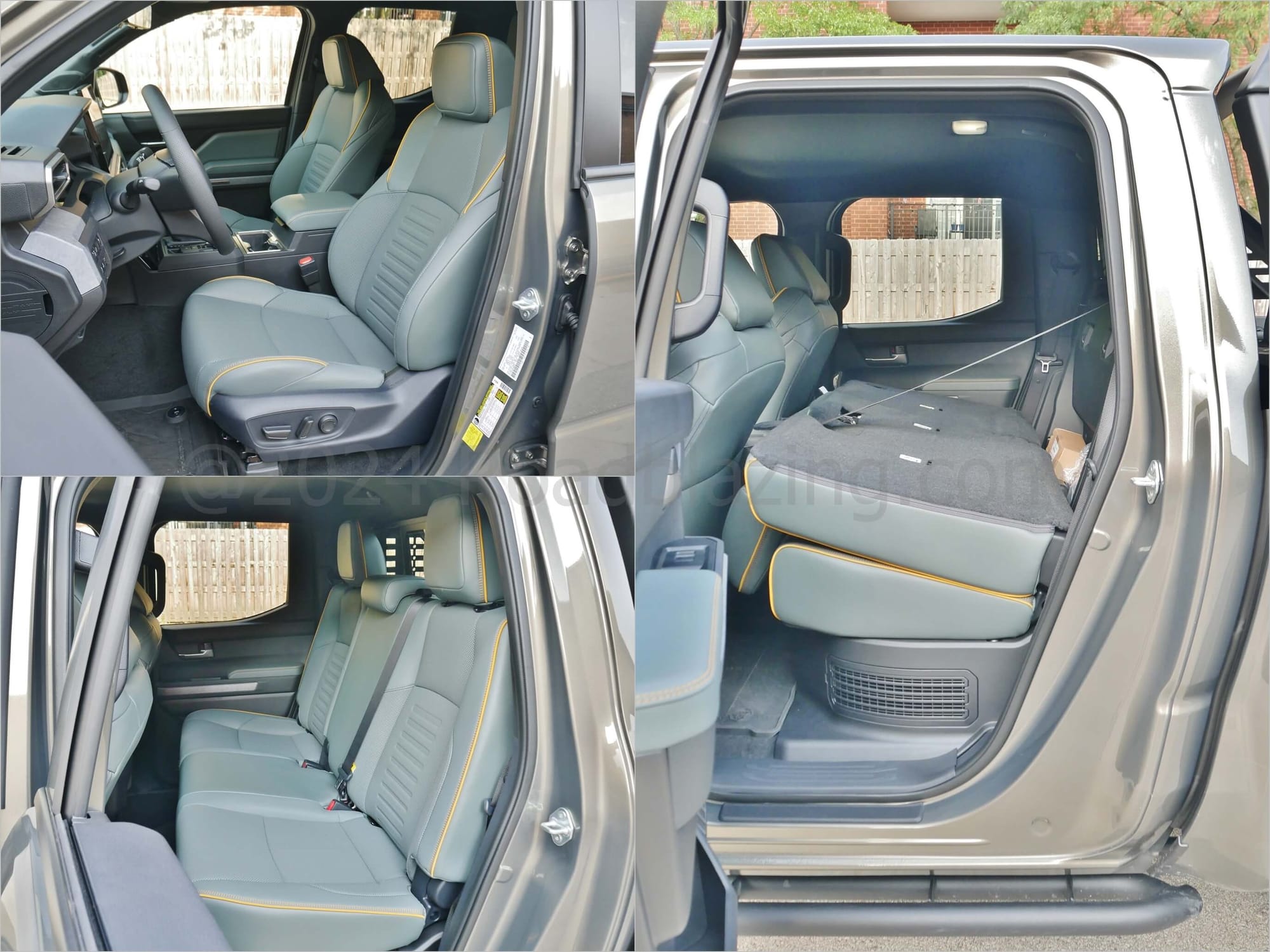 Cabin finishes range from soft leatherette seating, with tandem contrast yellow stitching, duplicated on door cars and middle dash to marble grain paneling. Creature comforts add cooled & heated powered front perches, dual zone climate control, the 14.0" Toyota Connected touch / voice command infotainment screen with apps, hands-free communication and wireless phone projection. The premium JBL audio now gains a dashtop-detachable, tailgating ready JBL Flex bluetooth speaker. Physical button switches for climate adjustment and rotary a knob for audio volume keep it simple.