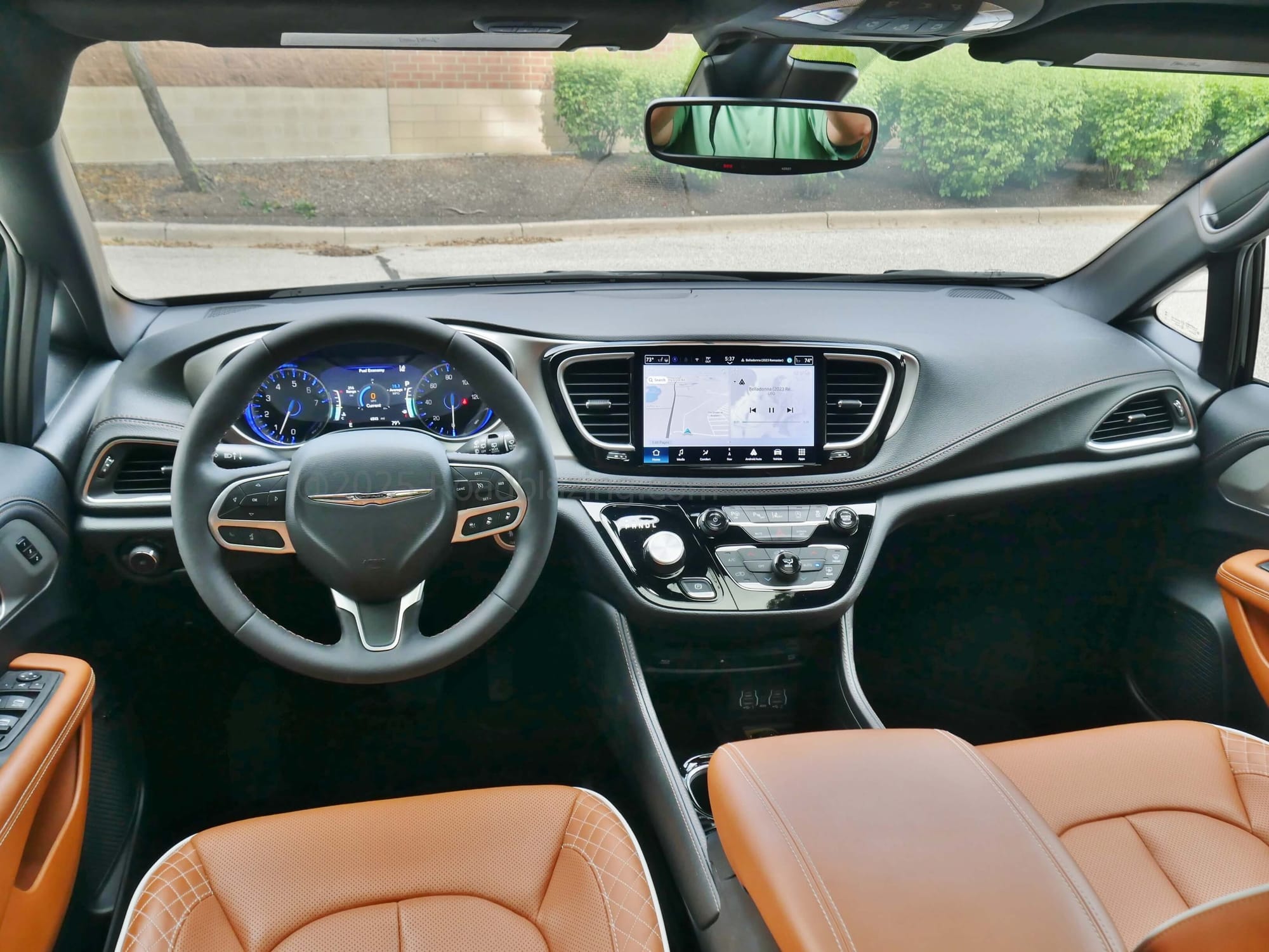 2025 Chrysler Pacifica Pinnacle AWD: classic twin dial gauges, upper center stack embedded media display, atop floating drive, climate & audio controls panel, second row headliner right side climate control