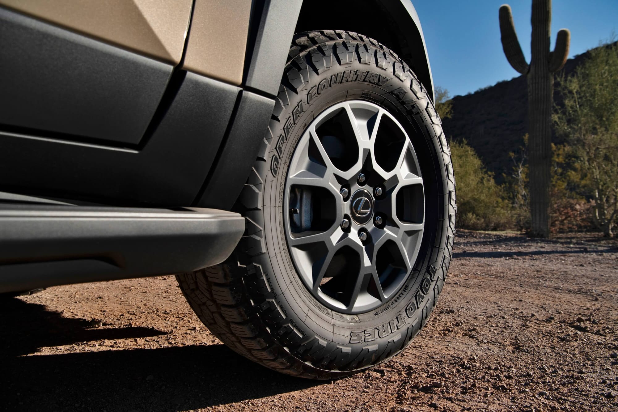 Insofar as Overtrail+ styling swag is concerned, the most off-road capable GX 550 is about two-tone color schemes. A darkened roof, with metallic banding, darkened B & C pillars, darkened lower cladding, darkened grille & wing mirror bezels, and metallic finished front & rear center lower fascia, contrast with specific terrain colors. The finishing rough-'n-tumble touch are the unique smaller diameter graphite wheels banded in tall sidewall all-terrain shoes.
