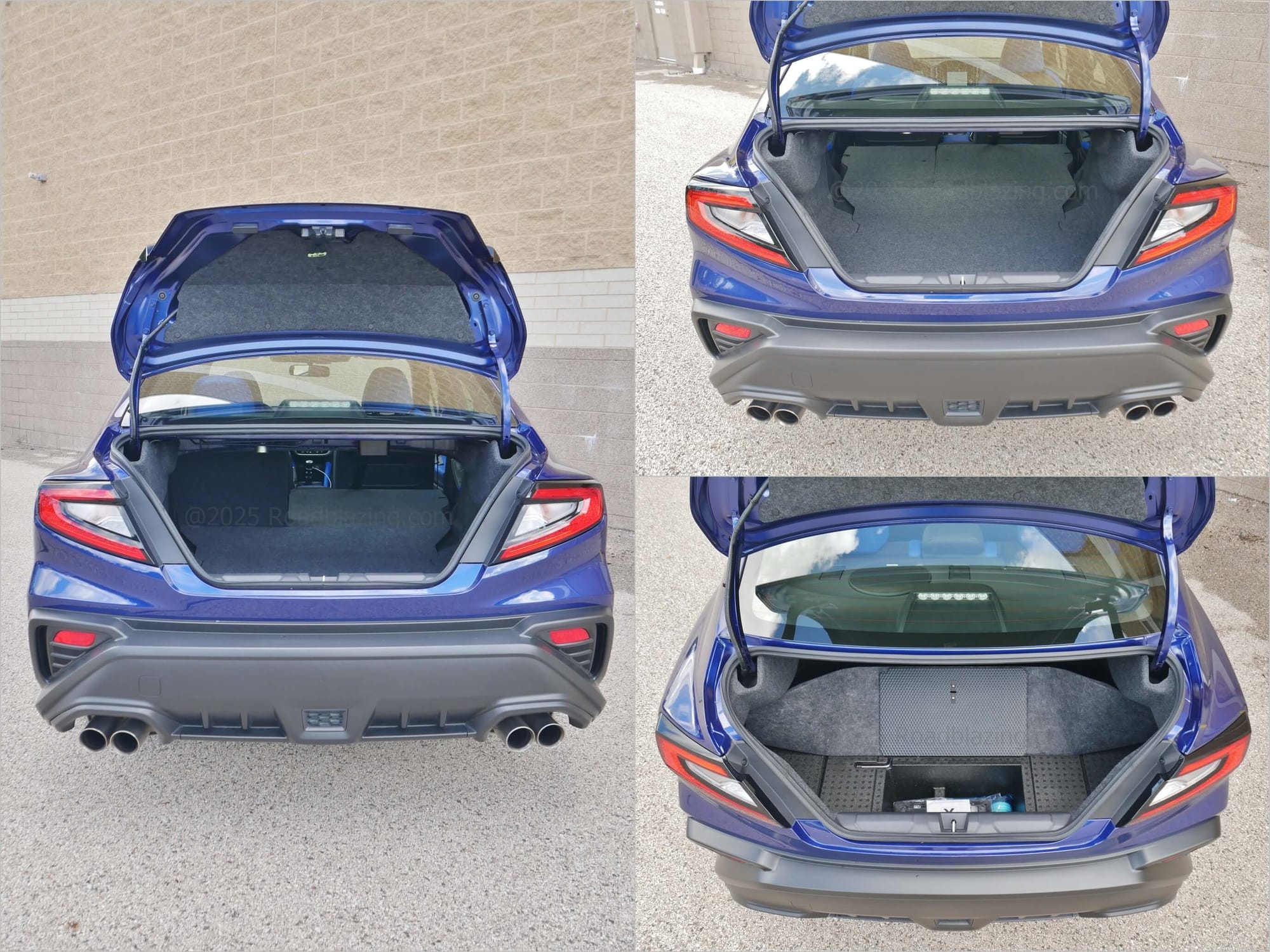 2025 Subaru WRX tS: popular proto rally sedan painted Sapphire Blue Pearl, with hood scoop, graphite full body cladding, double star spoke wheels and black trunk lid spoiler included