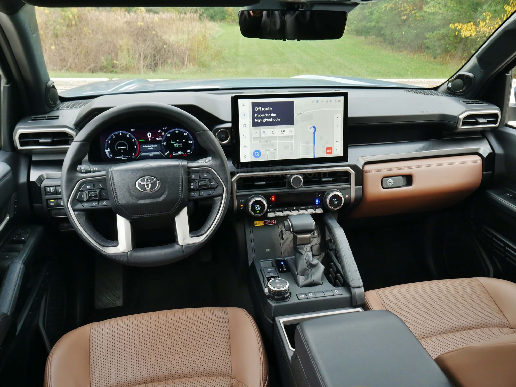 With the seating space elevated compared to the 5th generation, leather upholstered front buckets dole out comfort on moderate duration drives. The instrument cluster retains a glare blocking hood, sharing a unified housing with the media screen. Virtually every switch features a sating metallic bezel. Although there is nary a hard panel above waist height that is a touch point, the material finish eschews visual artistry for mid-level executive sterility. Curiously, as in cousin Tacoma, first row passengers have an integrated grab recess in the right A-pillar, while the driver has only the steering wheel to grab.
