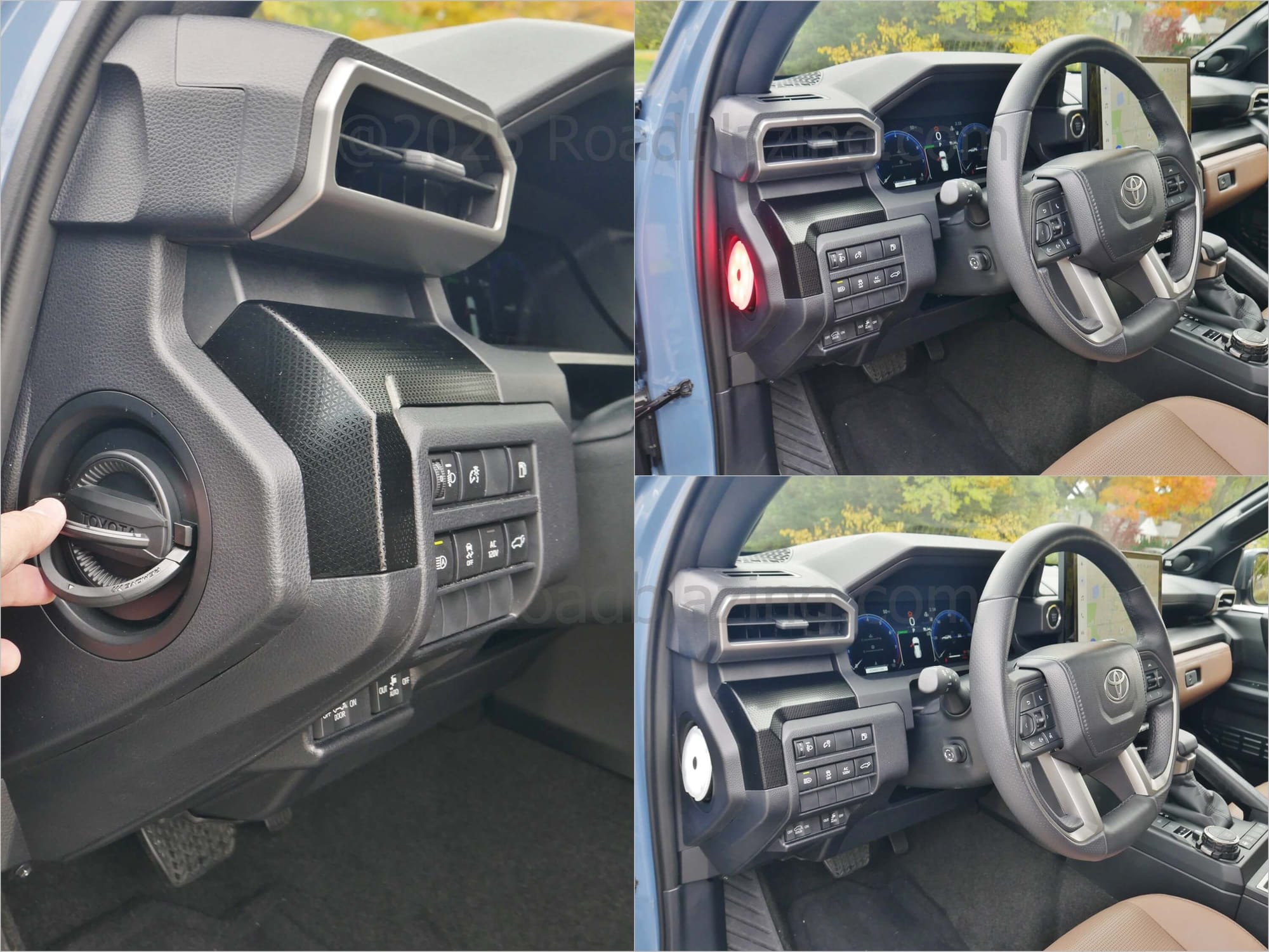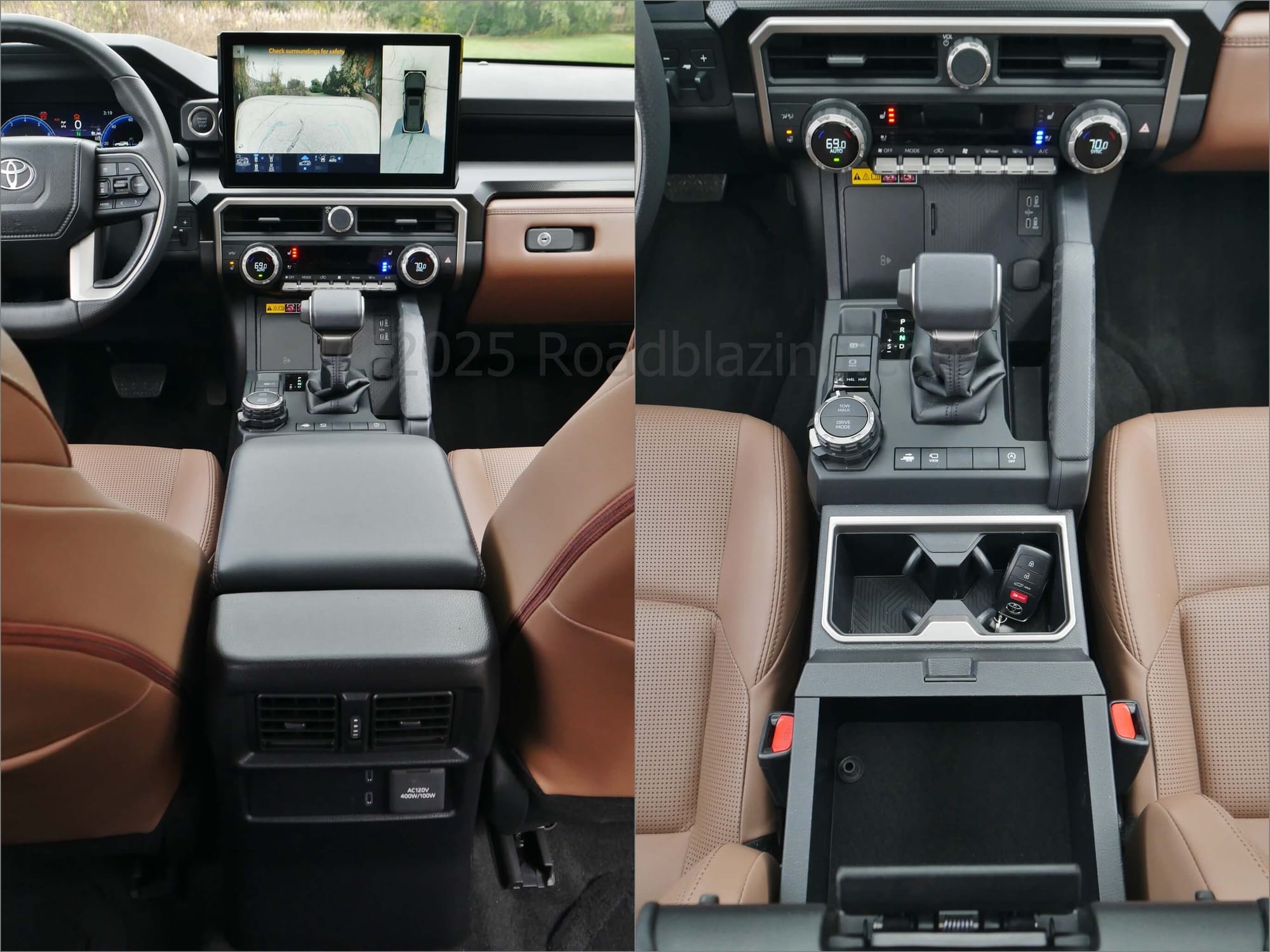 Twenty-first century Toyota truck occupant modernity finally drapes the new 4Runner's cabin. Gauges & screens have grown massively (12.3" and 14.0", respectively) and controls have been condensed into more ruggedized knobs and shift levers. The age old parking brake hand lever is replaced by a e-toggle switch, freeing up considerable center console space, adding a passenger side grab handle, with Molle style fencing.
