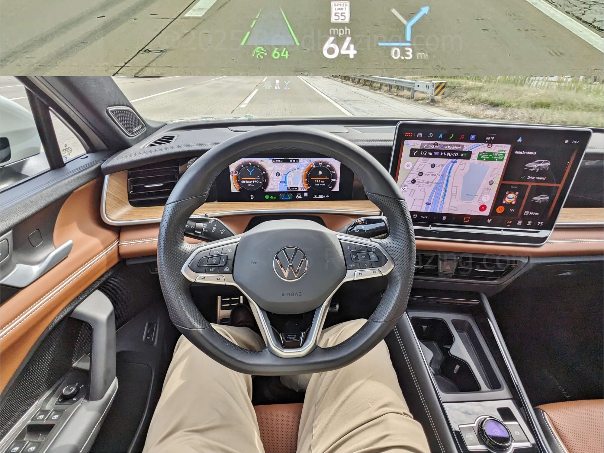 HOW PEOPLE FRIENDLY: The 2025 VW Tiguan continues cabin minimalization through adoption of new connective technology, with a more capable operational user interface, with impressive voice command capability. However, the update brings more touches of refinement. Display graphics have been improved, and there is more contrasting in materials as well as touch point padding. Dashboard layout and vent integration is among the more cohesive and rather artful. Accent panels offer improved contrast, and the simulated wood grain is convincing. Never before has there been such choice in ambient cabin colorization or 1st Row massaging seats at the price point, in the segment.