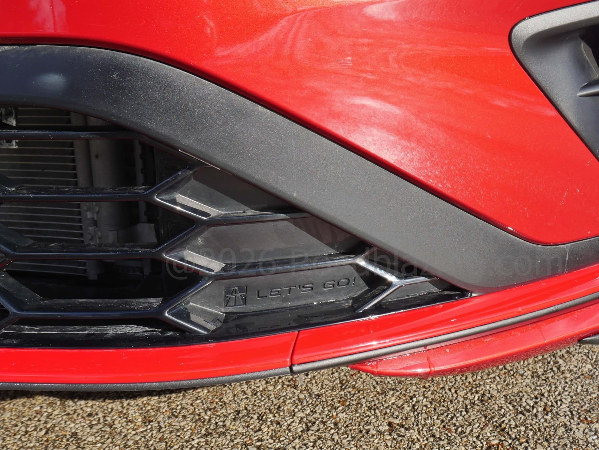 - Taller lower intake grille, angled body color cantilever arms bisect form inverted triangle corner fold, red tracing from lower air dam up to outer corner folds